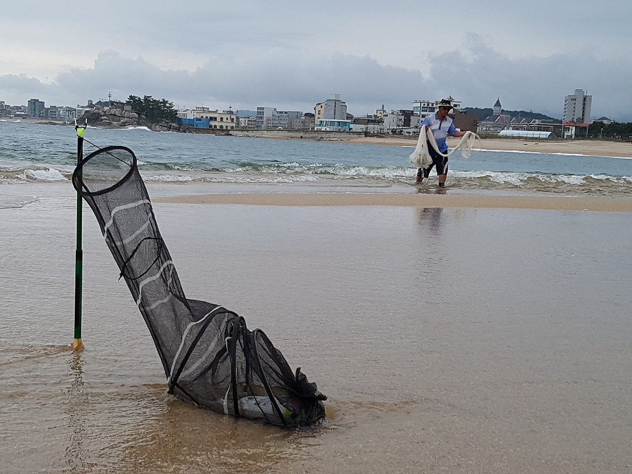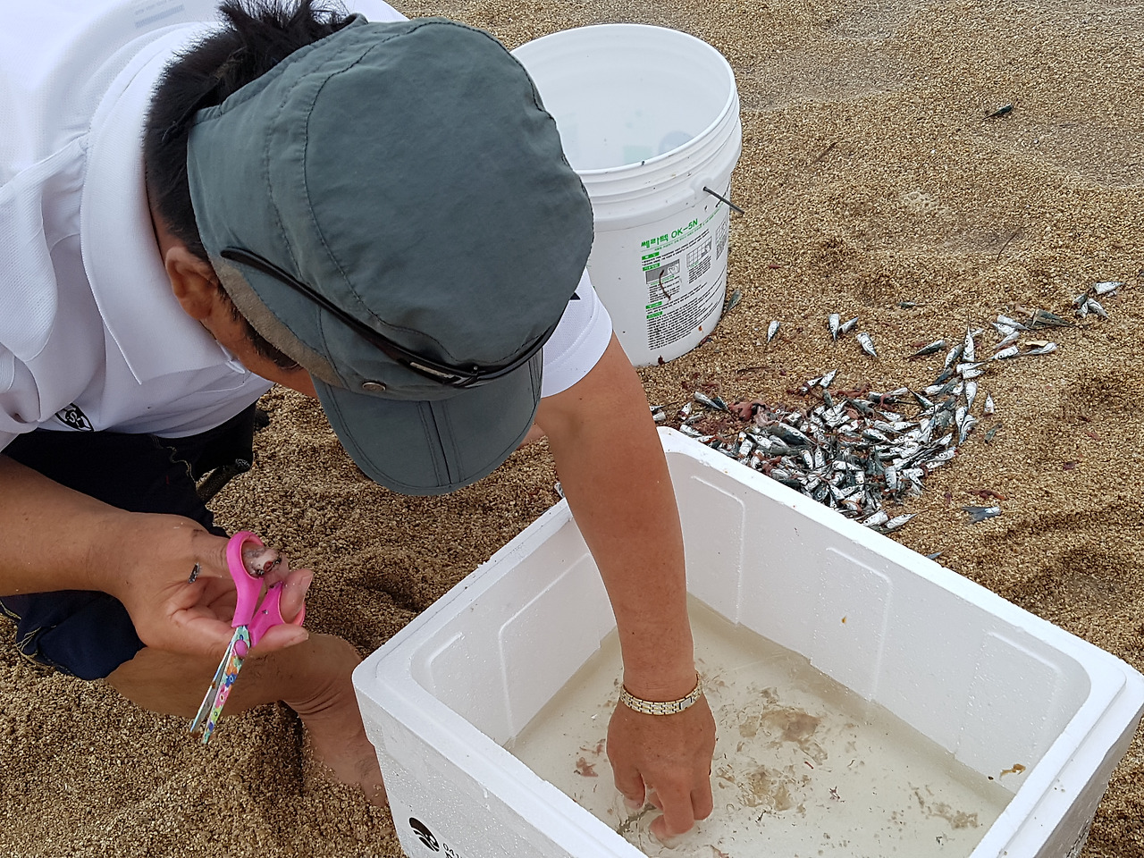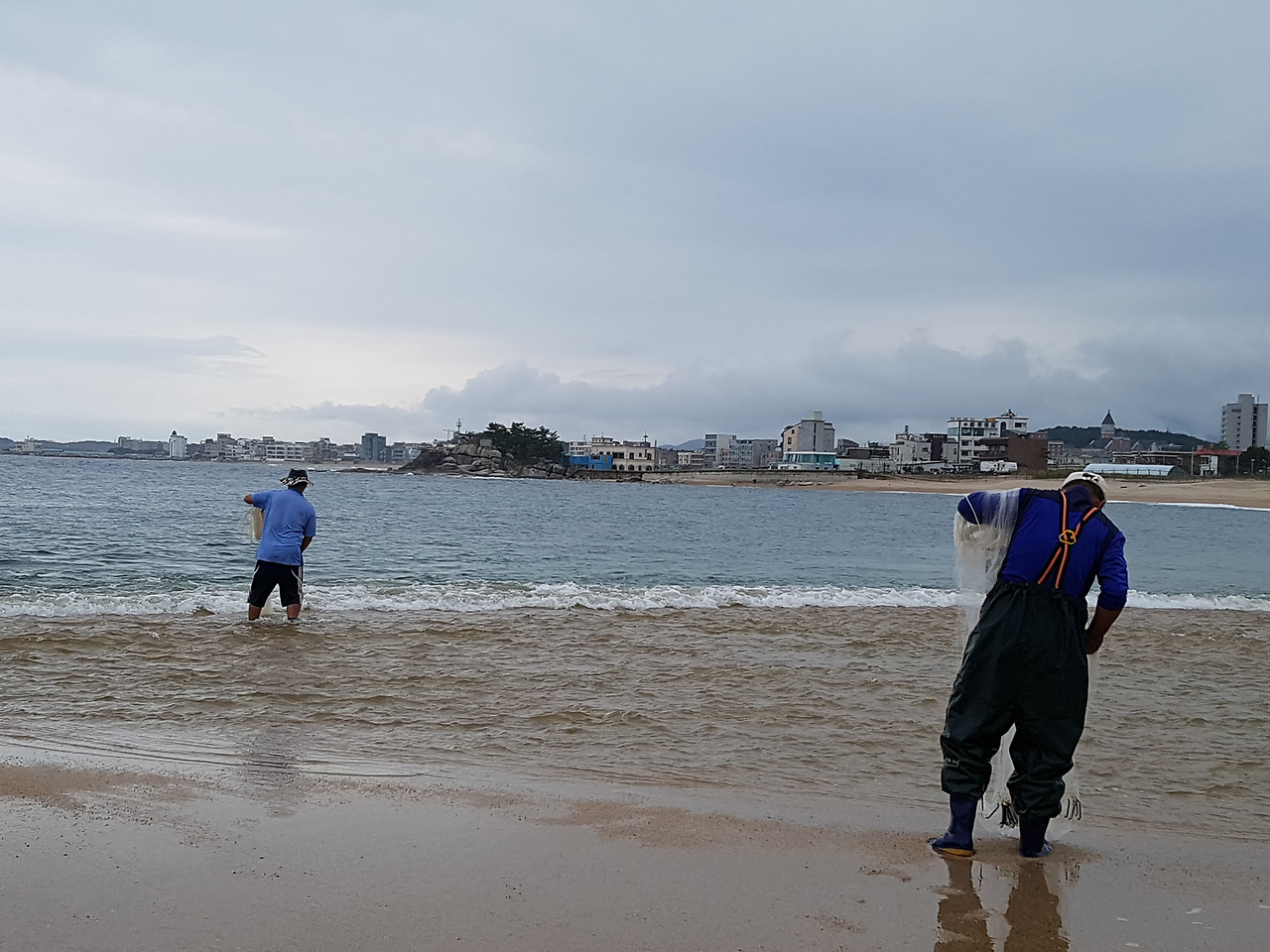 아저씨 두 명은 열심히 투망낚시중였고 한 아저씨는 그 두 아저씨가 잡아온 학꽁치와 어린 전어를 손질 중이었다.