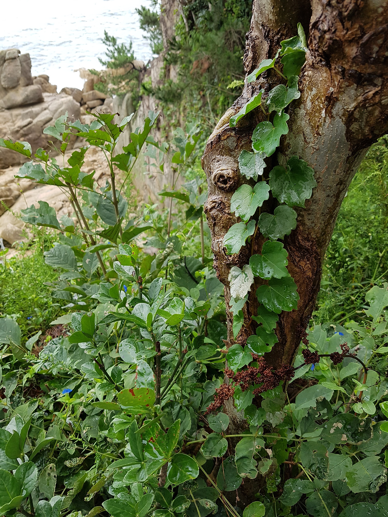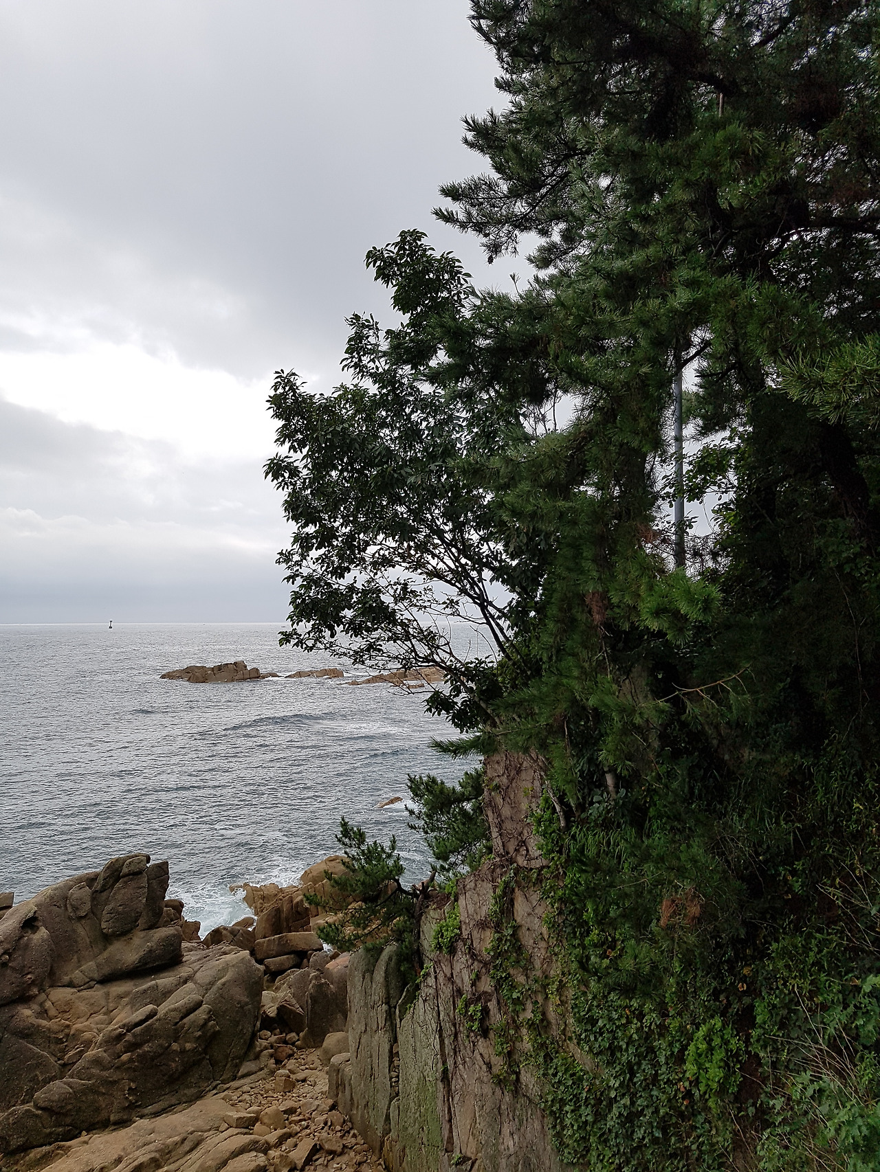 정자까지 오르는 거리는 정말 얼마 되지 않지만. 오르는 계단이 가파르다. 바닷가 쪽으론 절벽 위에 정자가 있고 그 뒤로 소나무가 산을 이룬다.