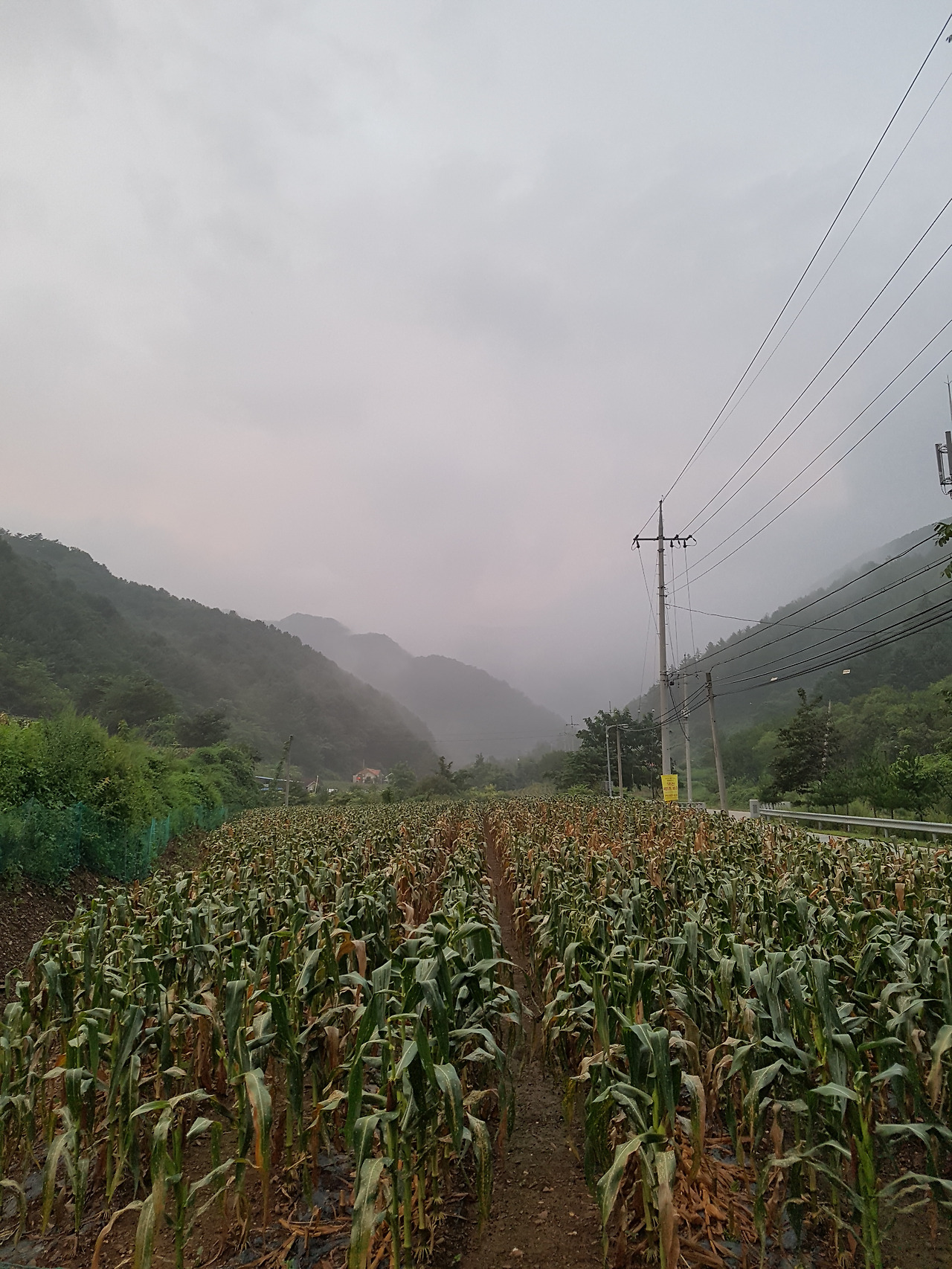 민박집 옆에 흐르는 청아하게 들리는 계곡에 한번 더 들어가서 물놀이를 했다. 산봉우리부터 폭포수처럼 흘러 내려오는 구름이 너무나 멋져보였다.