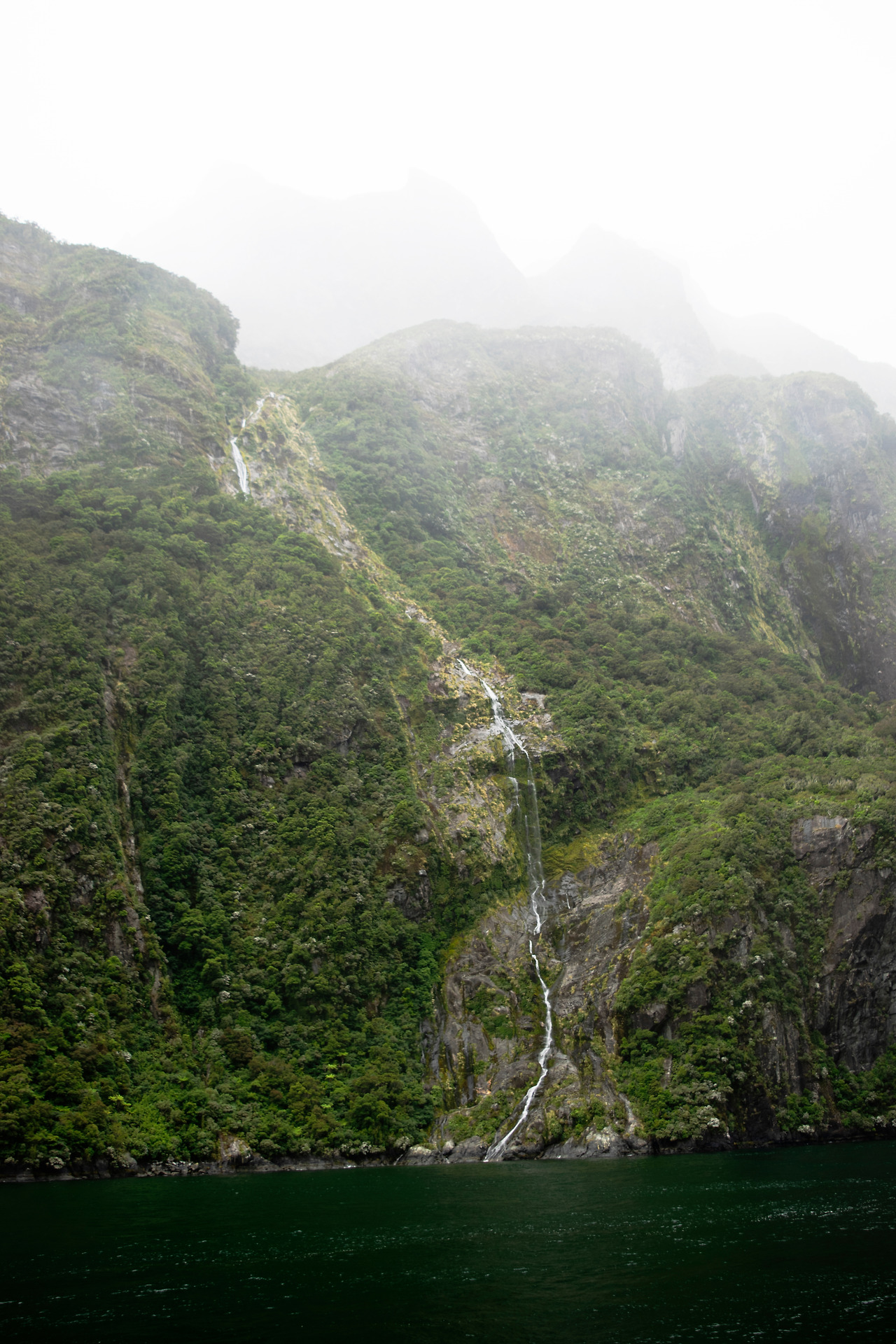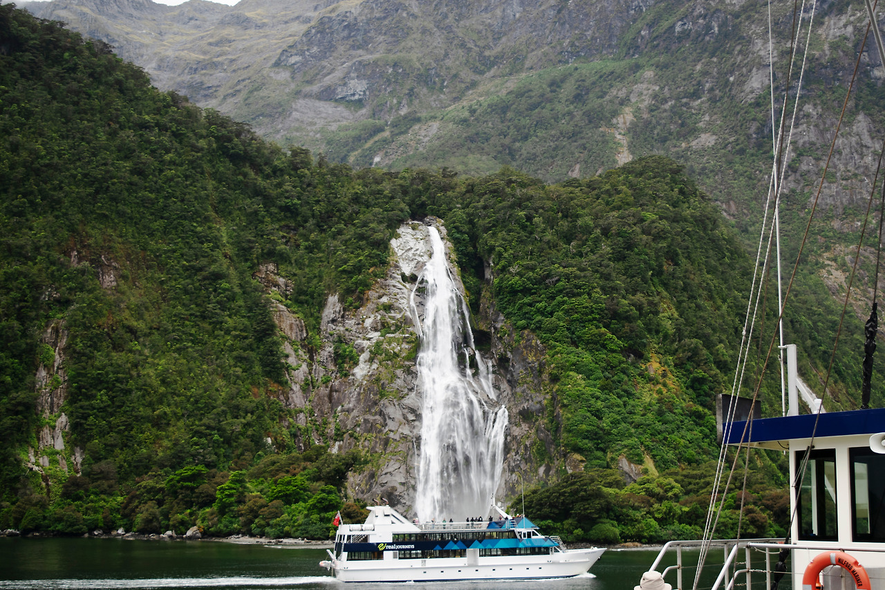 160m 높이에서 떨어지는 ‘보엔 폭포 Bowen falls’와 멋진 능선의 ‘마이터 피크 Mutre peak’를 보면서 피오르드에서 가장 폭이 좁은 지역인 ‘코퍼포인트 Copper point’로 배는 간다. 망망대해인 테즈먼해의 입구에서 배는 방향을 바꿔 다시 피오르드로 돌아온다. 바다 위 바위에서 햇빛을 쬐고 있는 물개들이 보이고, 폭포 가까이 배가 다가가 여행객들의 온몸을 폭포수로 흠뻑 적시게 한다.