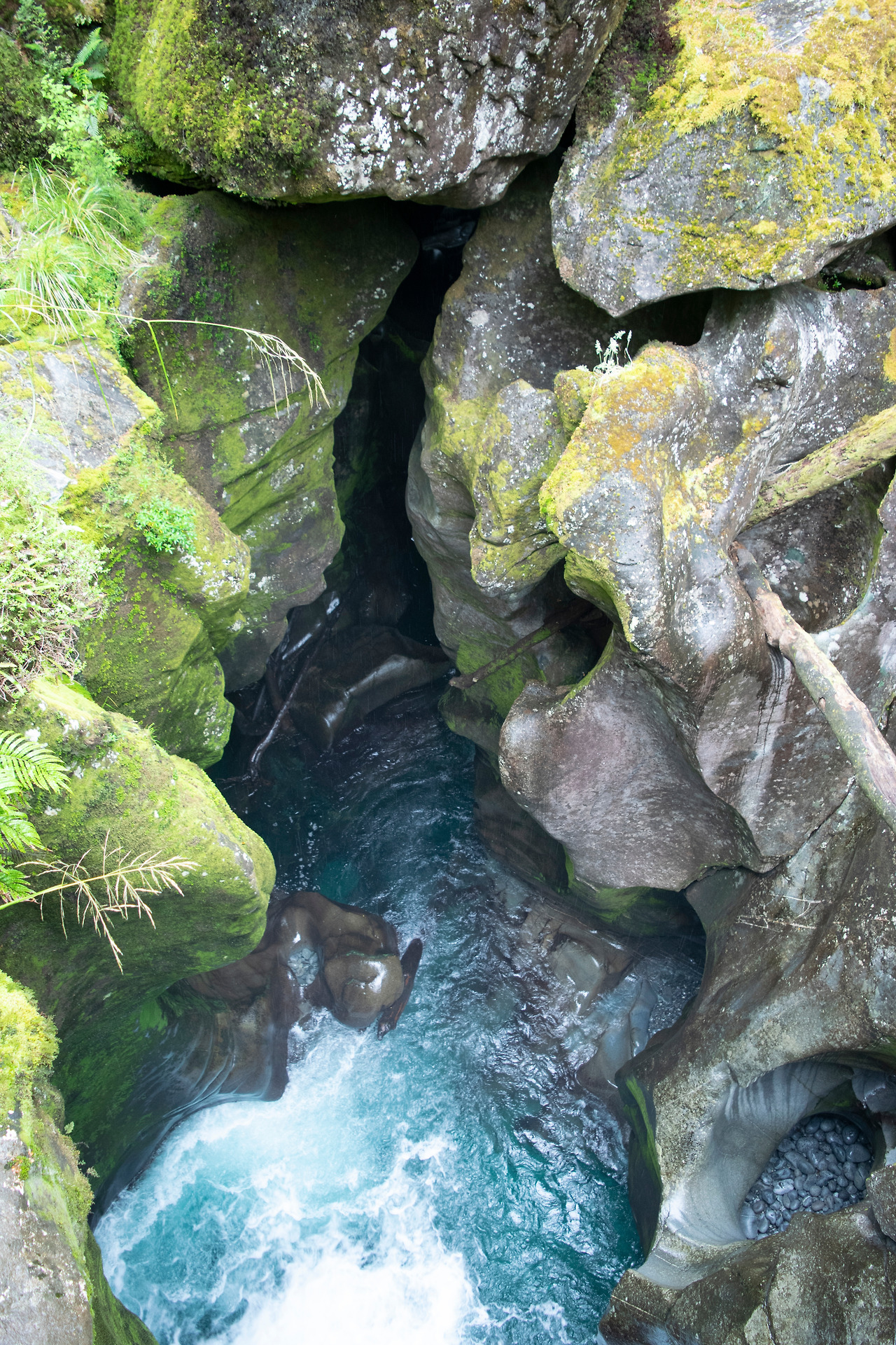 크루즈 관광을 마친 후 우리는 어젯밤을 보냈던 ‘캐즘 Chasm’으로 다시 갔다. 우리가 밤을 보냈던 주차장의 자리에는 우리 대신에 커피와 음료수를 파는 푸드트럭이 자리를 잡고 있었다. 새벽 일찍 퀸스타운에서 출발한 것으로 보이는 단체 관광객들도 많았다. ‘캐즘’은 옥색 물이 이끼 덮인 바위를 깎아 만든 기암괴석과 함께 많은 수량의 물이 급격한 용틀임으로 굉음을 내는 좁은 폭의 환상적인 폭포였다.