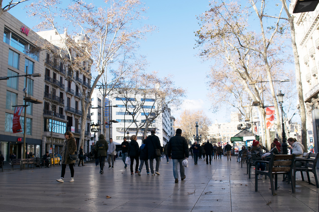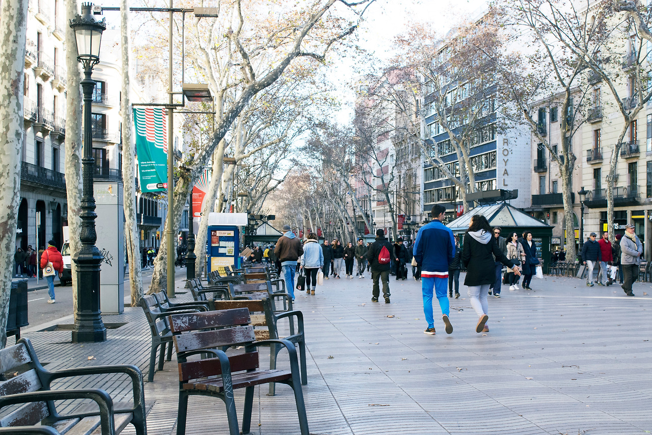 “까탈루냐 광장”에서 시작하여 “콜럼버스 동상” 전망대가 있는 “포르탈 데 라 파우 광장” Portal de la Pau 해변까지 도보로 약 10여분 정도의 거리가 바르셀로나의 메인 스트리트인 “람브라스 거리” La Rambla이다. 이 거리를 중심으로 동쪽에 구시가지의 중심인 “바리 고딕 지구” Barri Gothic와 “보른 지구” Borrn 가 자리 잡고 있고, 서쪽으로 “보케리아 시장” La Boqueria과 “구엘 저택” Palau Guell 이 있다. 바람이 심하게 불어 꽃 가게나 기념품 상점들도 일부 문을 닫아 마치 우리나라의 초겨을 같은 스산한 분위기에 빠져있는 “람브라스 거리”를 걸었다.