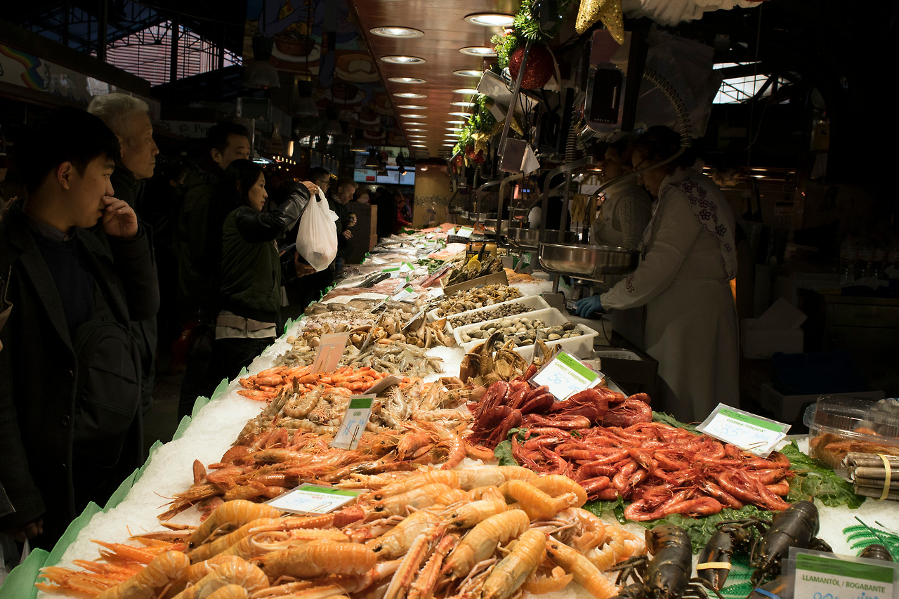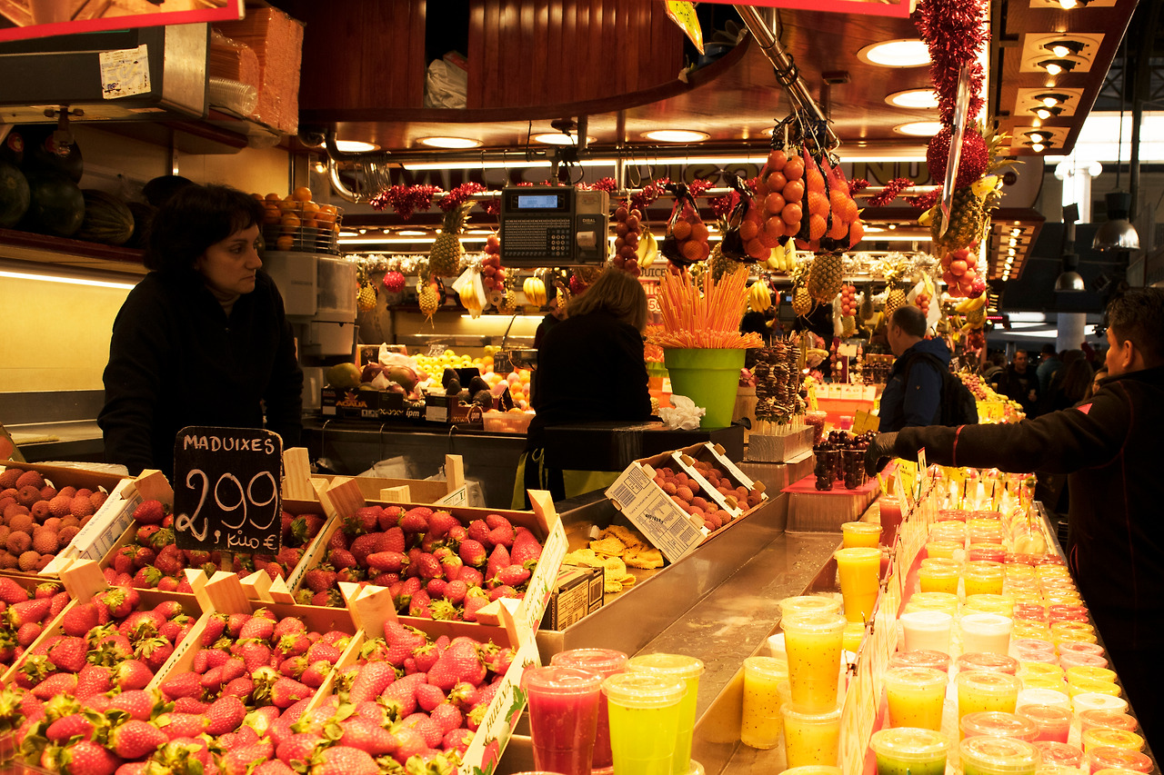 조금 걷다 보니 “보케리아 시장”이 나타났다. 470개의 상점이 모여있는 바르셀로나에서 가장 큰 재래시장이라는 명성답게 관광객들로 넘쳤다. 입구에 들어서자 제일 먼저 컬러풀한 각종 과일들이 눈에 들어왔다. 옆에서는 과일로 생주스를 만들어 팔기도 하고, 시장의 더 안쪽에서는 채소, 하몽, 생선, 과자 등을 파는 곳도 있었다. 시장 입구 맞은편 건물 3층 창가에서는 “마릴린 몬로”로 분장한 마케터가 관광객들에게 손키스를 보내는 프로모션 활동을 하고 있었다.