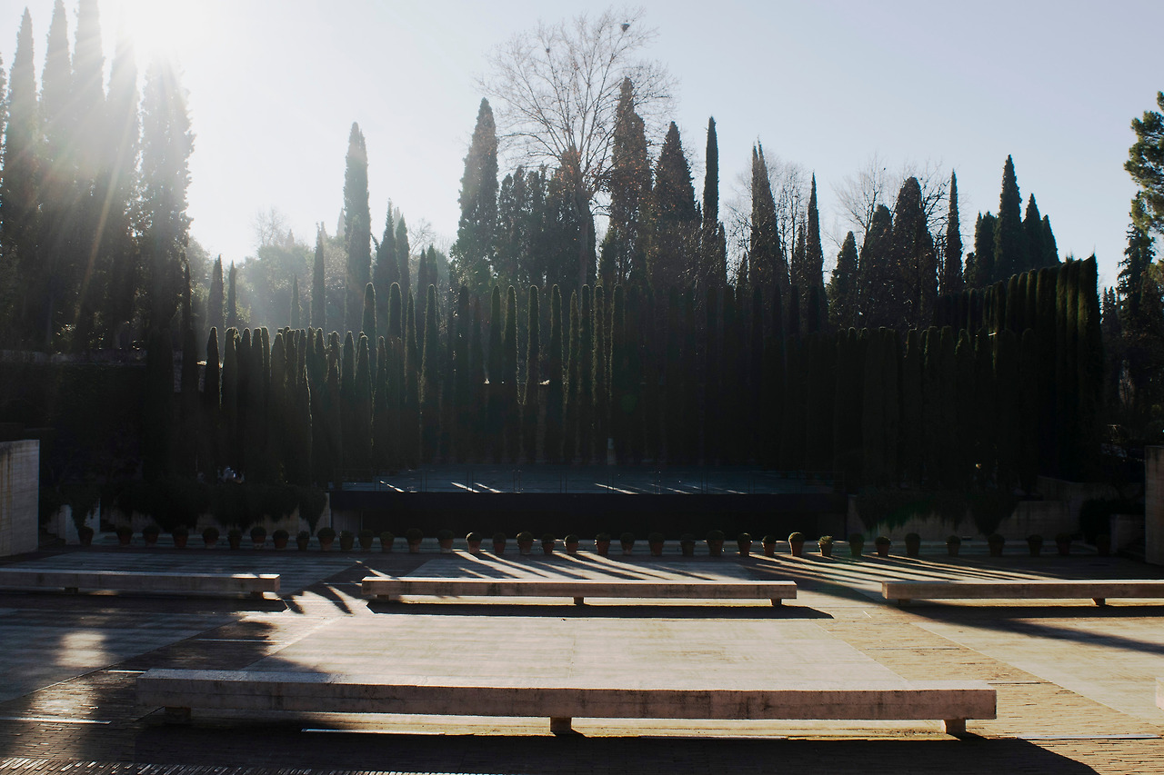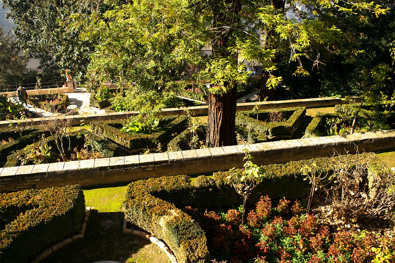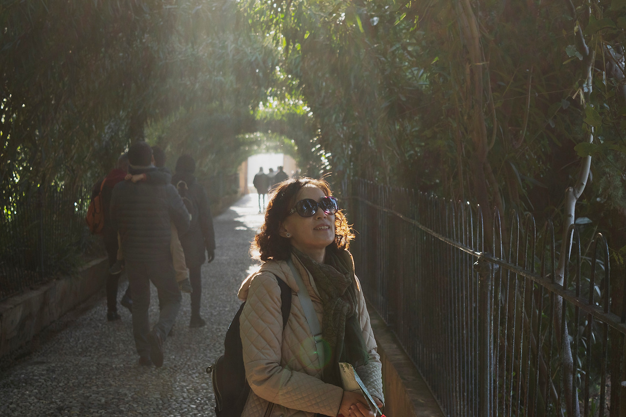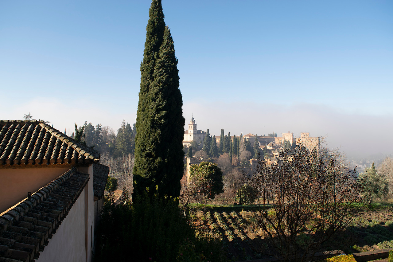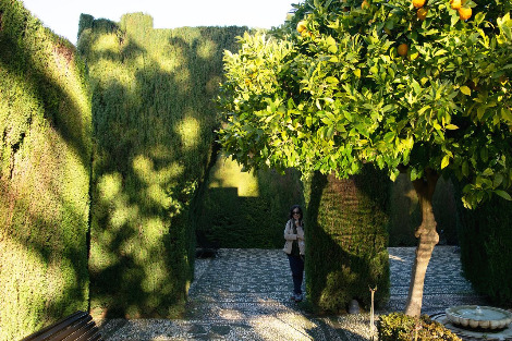 궁전 안으로 들어서니 “마치 이집트의 오벨리스크 같다”며 화가 “반 고흐”의 사랑을 받은 사이프러스 나무들이 양 옆으로 쭈욱 늘어선 길이 펼쳐졌다. 하늘을 향해 곧게 쭉쭉 뻗은 나무들 사이로는 시에라네바다 산맥을 넘어온 아침 햇살이 내려오고 있었다. 먼저 궁전 위쪽 언덕 기슭에 자리 잡은 “무하마드 3세” 때 건설된 “왕들의 여름 별장” “헤네랄리페”로 향했다. 걷는 길 맞은편으로 사이프러스 나무와 숲이 그리고 그 사이로 붉은색을 띤 궁전과 성벽들의 모습이 보였다.