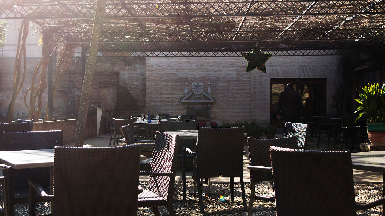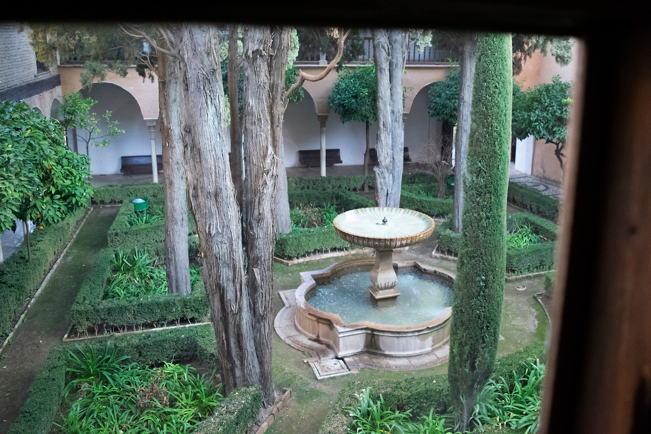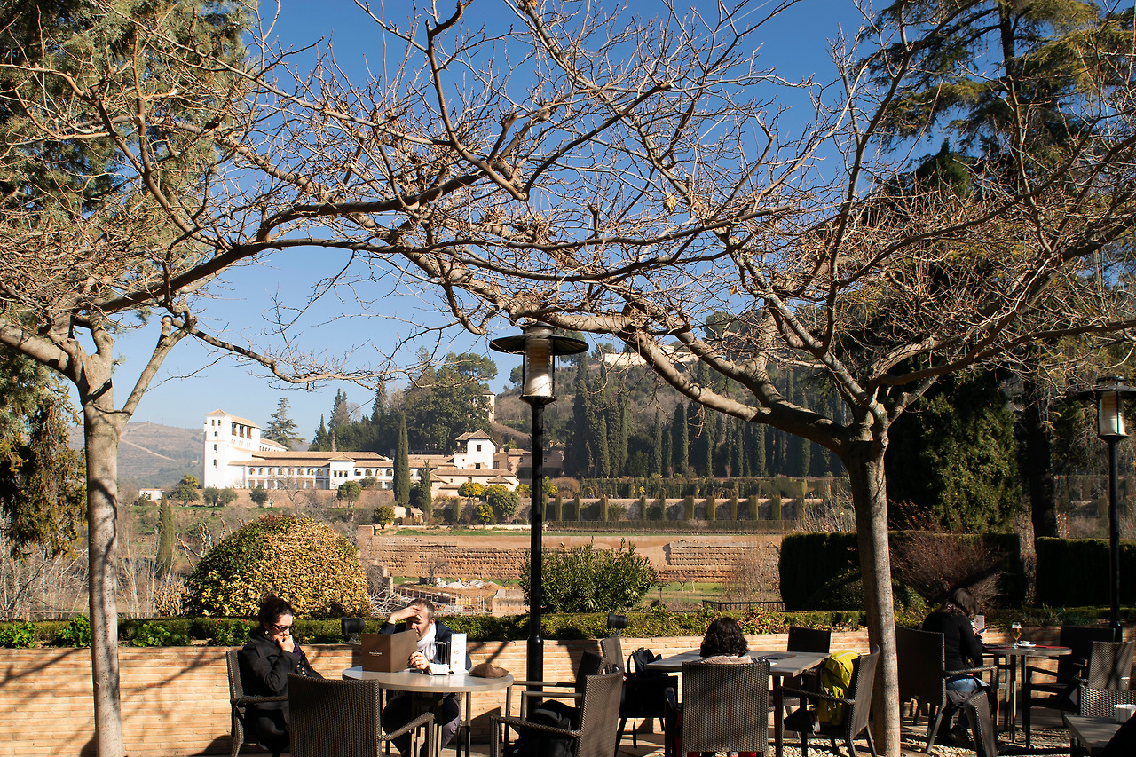 처음 입장했던 곳까지 와서 다리를 건너 성의 본채로 갔다. 가는 길 양 옆으로 잘 다듬어진 사이프러스 나무들이 그늘을 만들어주고 있었다. 걷다 보니 알람브라 궁전의 파라도르 “파라도르 데 그라나다 Parador de Granada”가 나타났다. 잠시 쉬기도 할 겸 안으로 들어가 커피숍의 야외 테이블에 앉아 건너편으로 보이는 헤네랄리페를 감상하며 여유 있는 시간을 보냈다. 중세 교회 느낌이 나는 “파라도르 데 그라나다”는 15세기 이슬람의 모스크를 프란시스코 수도원으로 개조하여 사용하여 왔는데, 그 수도원을 다시 개조해서 1945년에 호텔로 개장 한 곳이라고 한다. 야외 커피숍 앞이 식물원식 정원인데 겨울이어서 꽃들이 피지 않아 잠깐 둘러만 보았다.