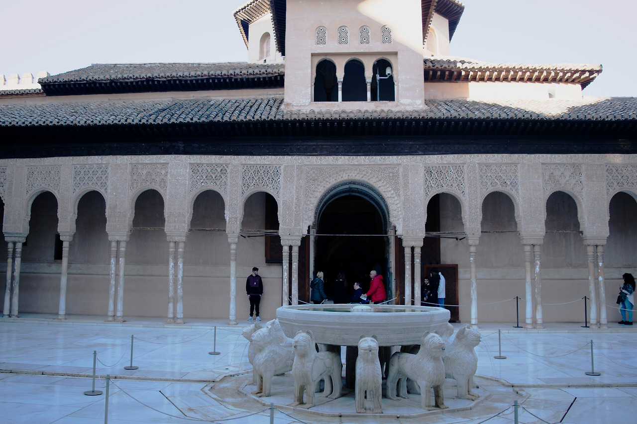 “아리야네스 정원”과 함께 나사리에스 궁전의 대표적 명소라고 할 수 있는 곳이 “사자의 안뜰 Patio de los Leones”이다. 중앙에 유대인이 아랍의 왕에게 선물했다는 12마리의 흰 대리석 사자상이 떠 받치고 있는 분수가 있고, 분수를 중심으로 네 방향에 있는 건물들과 수로로 연결되어 있다. 정원을 중심으로 둘러싸고 있는 건물들을 받치고 있는 대리석의 기둥은 모두 124개라고 한다.