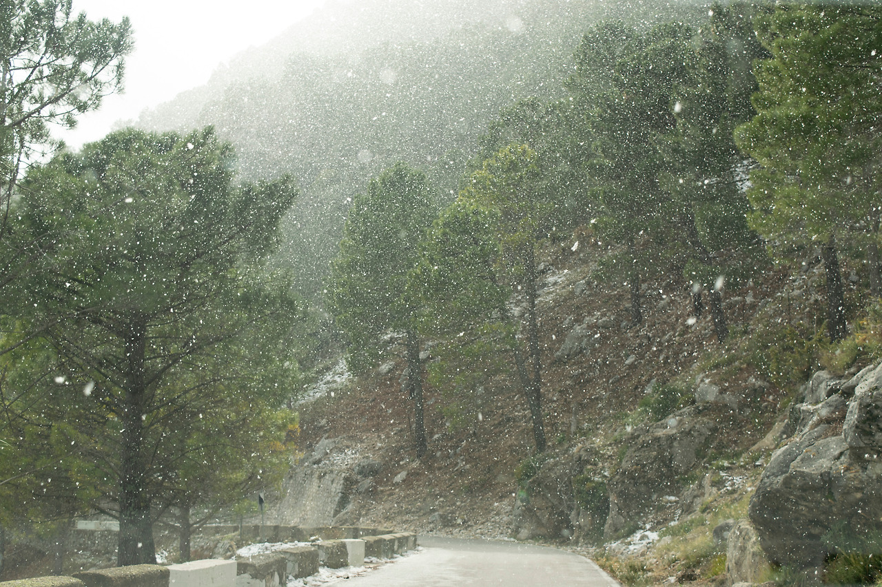 다음 목적지인 “자하라 Zahara de la Siera”를 향했다. 산 위로 올라가니 제법 눈발이 날리기 시작하였다. 내비게이션의 안내에 따라가는 데, 도로를 바리케이드로 막아 놓은 것 같기도 하고 아닌 것 같기도 한 판단하기 어려운 애매한 상태로 바리케이드가 놓여 있었다. 그냥 바리케이드를 지나쳐 내비게이션의 안내에 따라갔다. 아까보다 더 많은 눈이 내리기 시작했다. 이때 차에 내장되어 있는 내비게이션에서도 “눈길 조심”이라는 안내 문구가 떴다. 그런데 느낌이 좀 이상했다.