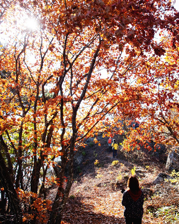상쾌한 공기를 맘껏 들이마시며 경내를 둘러보다 우연히 마주치게 된 스님께서 전망 좋은 바위가 있는 곳을 가리켜 주었다. 그 바위를 찾아 숲 속 길을 걸을 때 일부러 소리 나게 낙엽을 밟아 부스럭 거리는 소리를 들어 보았다. 나뭇가지 사이로 비치는 아침 햇살은 눈이 부셨다. 바위 위에서 내려 다 본 자연은 온통 가을의 물결이었다. 가슴이 터질 거 같은 벅차 오름이 그녀의 안에서부터 용솟음쳤다.