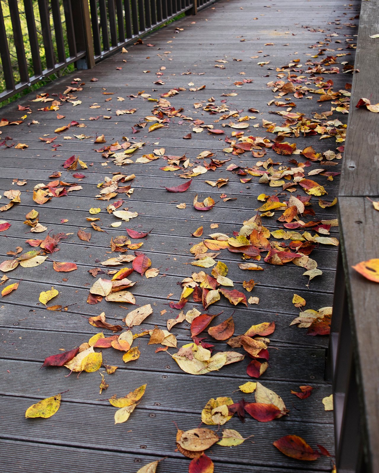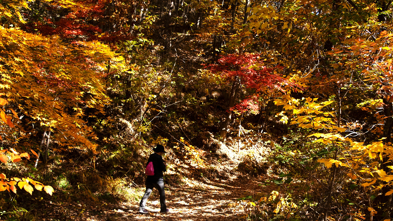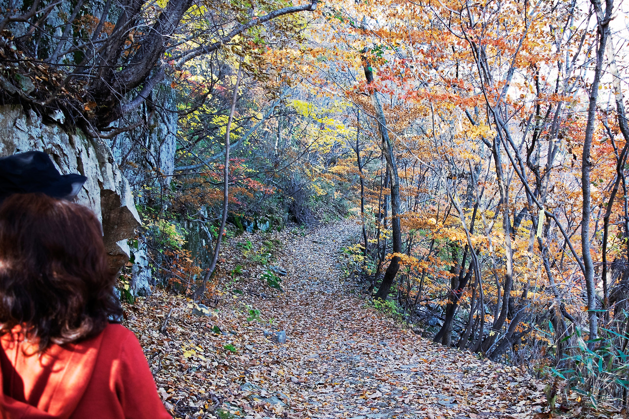 산길을 걷다 보니 중간에 흰색 그네가 덩그러니 나타났다. 두 사람은 그네에 앉아 준비해 간 따뜻한 커피를 함께 마셨다. 고개를 들어 바라본 갈색 나뭇잎들 사이로 파란 가을 하늘이 언뜻언뜻 보였다. 가을의 분위기가 물씬 풍기는 고즈넉한 숲 속에서 어떤 제약이나 방해도 없이 두 사람은 가을을 마음껏 누릴 수 있었다. 길이 끝나갈 즈음에는 가파른 내리막길이 시작되었다. 조금 더 내려가면 얕은 물이 흐르기도 했다. 물이 흐르는 계곡 옆으로 붉은색 단풍과 노란색 나뭇잎들이 지나가는 가을을 잡으려는 듯 가을바람에 떨고 있었다.