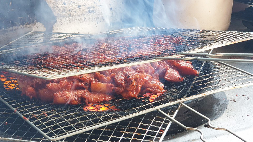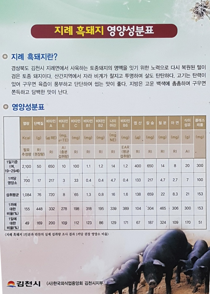 수도계곡 옆 도로로 내려와 콜택시를 불렀다. 택시를 탄 두 사람은 점심 식사를 하기 위해 지레면에 있는 지례흑돼지 식당 거리로 갔다. 지례흑돼지의 원산지에서 맛본 돼지고기는 원조의 풍미가 무엇인지 느끼게 해 주었다. 특히, 연탄불과 석쇠에서 구워 낸 흑돼지 양념불고기의 쫀득하고 고소한 맛은 정말 일품이었다.