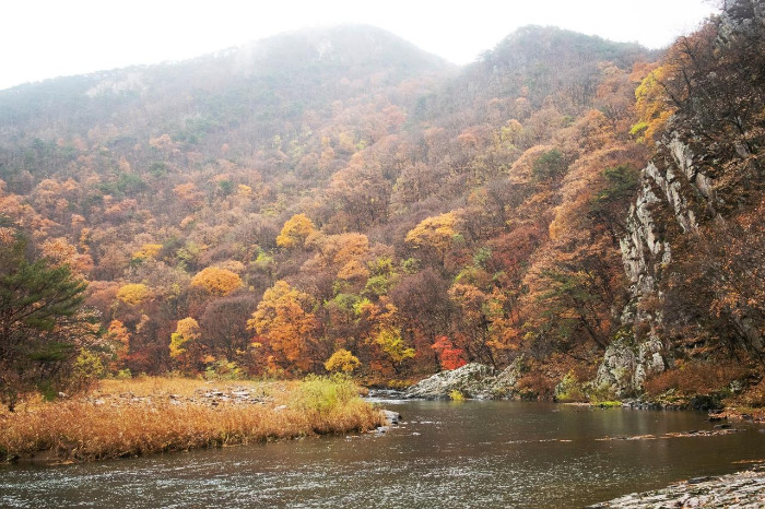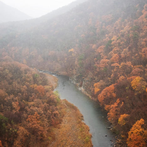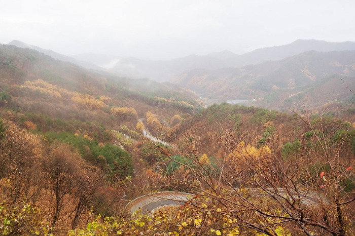 반야사로 가기 전 영동군 황간에서 전북 무주로 넘어가는 고갯길엘 먼저 들렸다. 해발 800m의 ‘도마령’이다. ‘말을 키우던 마을’ 혹은 ‘칼 찬 장수가 말을 타고 넘던 고개’라는 데서 유래된 이름이라고 한다. 황갈색 잎으로 변한 나무들이 덮여 있는 구불구불 내려가는 길 너머로 겹겹이 산들 사이에 낀 안개. 11월 가을의 풍경은 왜 이렇게도 정겨운지…….