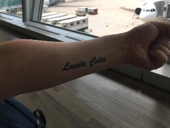 탑승 게이트로 가는 중 ‘타투 프로모션’ 행사장에 사람들이 많이 모여 있는 것이 보였다. 대기 줄에 서서 10여 분을 기다린 후 태어나 처음으로 내 팔에 타투를 그려 넣었다. "Lucete Celse" "고귀하게 빛나라"라는 뜻의 라틴어란다.