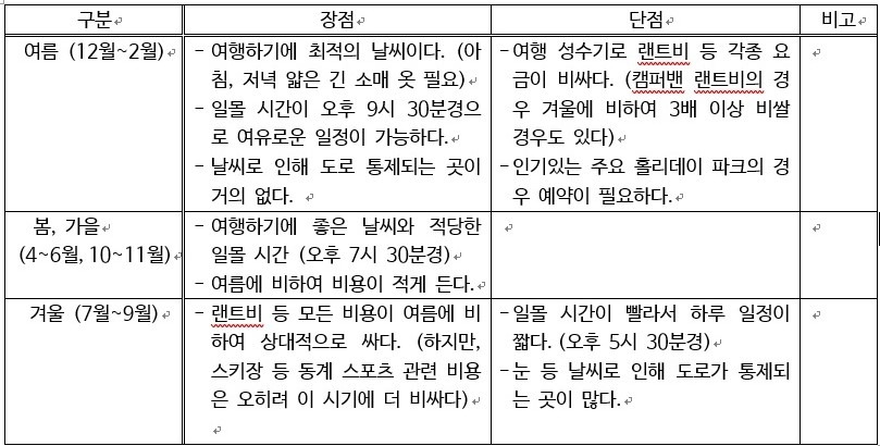 우리나라와 계절이 반대인 뉴질랜드는 어느 계절에 여행하는 것이 좋을까? 날씨, 비용 등을 고려하여 계절별 장단점을 정리하면 다음과 같다.