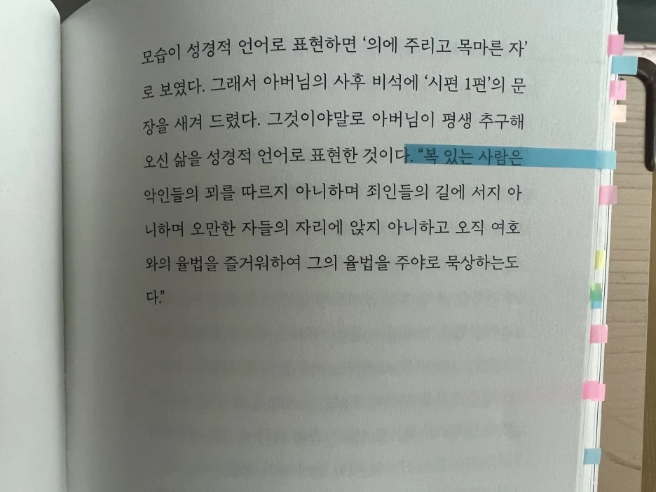 자식에게 사랑 한 번 주지 않은 부친을 공경한 저자도 대단하지만 그의 아내는 그보다 더했다. 부모의 반대에도 무릅쓰고 그는 지금의 아내와 결혼을 했다. 아내는 노쇠한 시아버님의 대변을 받고 삼시 세끼 따뜻한 집밥을 해드렸다. 무엇보다 아내는 시아버님을 아주 존경했다. 친부여도 하기 힘든 일을 투정 한 번 부리지 않았으며 모두가 요양 병원에 모시자고 했을 때 손사래 친 것은 다름 아닌 그녀였다. 존경과 감탄이 나오는 대목이 아닐 수 없었다. 이 일화만 봐도 저자는 사람 보는 눈이 아주 대단하다고 생각했다.
