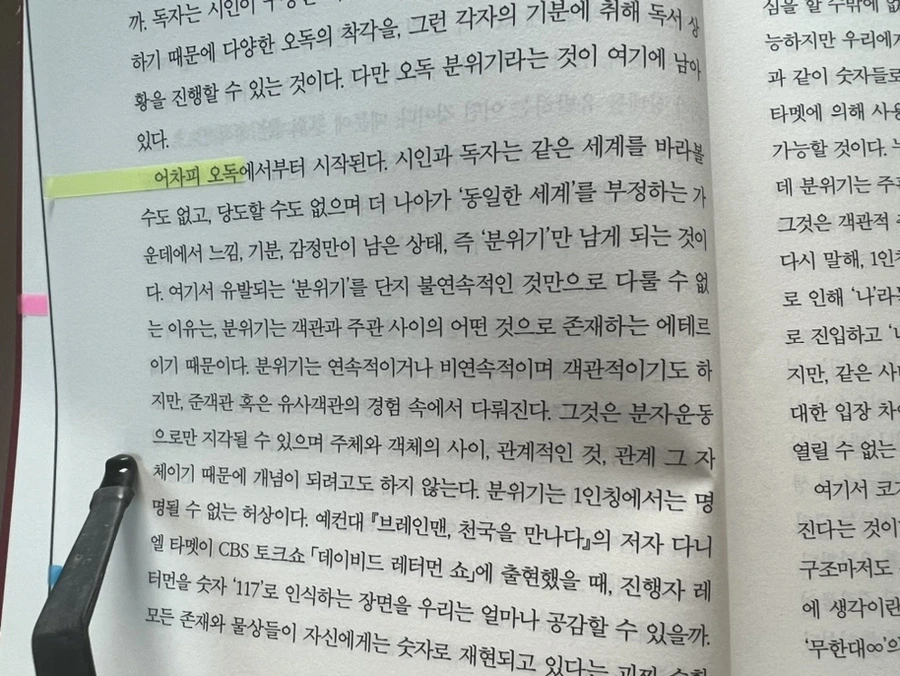 어차피 오독에서부터 시작된다. 시인과 독자를 같은 세계를 바라볼 수도 없고, 당도할 수도 없으며 더 나아가 '동일한 세계'를 부정하는 가운데에서 느낌, 기분, 감정만이 남은 상태, 즉 '분위기'만 남게 되는 것이다. 여기서 유발되는 '분위기'를 단지 불연속적인 것만으로 다룰 수 없는 이유는, 분위기는 객관과 주관 사이의 어떤 것으로 존재하는 에테르이기 때문이다.