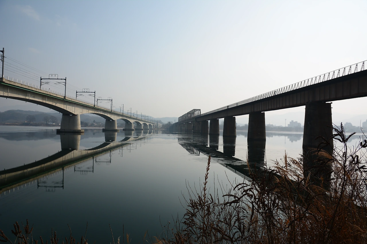 하나는 전철이 지나다니고, 하나는 자동차가 지나다니는 다리라는 것을 알 수 있다.