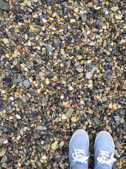 여러 가지 색깔, 다양한 모양의 자갈길 위에
