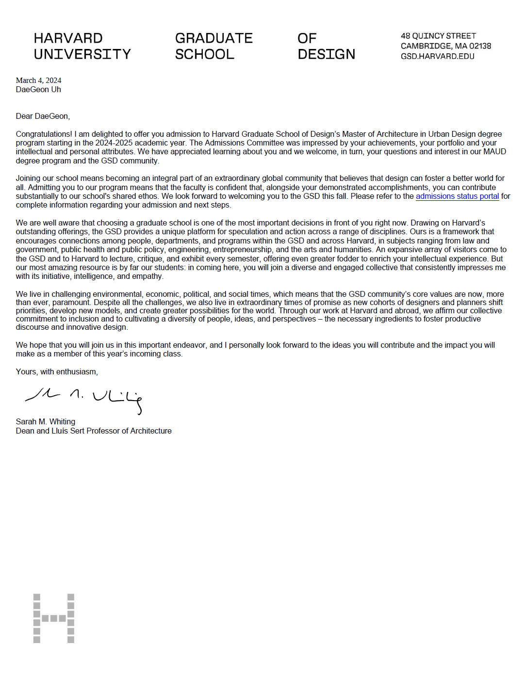 "Congratulations! I am delighted to offer you admission to Havard Graduate School of Design's Master of Architecture in Urban Design degree program starting in the 2024-2025 academic year. The Admissions Committee was impressed by your achievements, your portfolio and your intellectual and personal attributes."