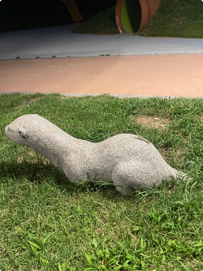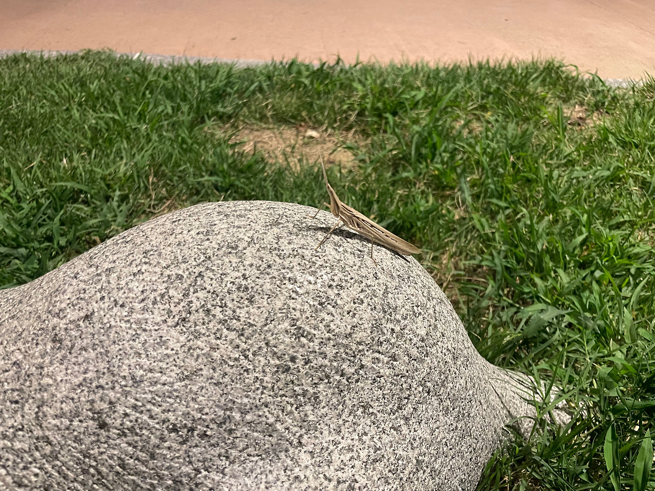 신천 둔치를 걷다가 수달 조각상을 보았다. 그 돌 위에는 방아깨비 한 마리가 올라앉아 있었다. 내가 가까이 다가가도 도망가지 않는 의연함을 보여주었다.