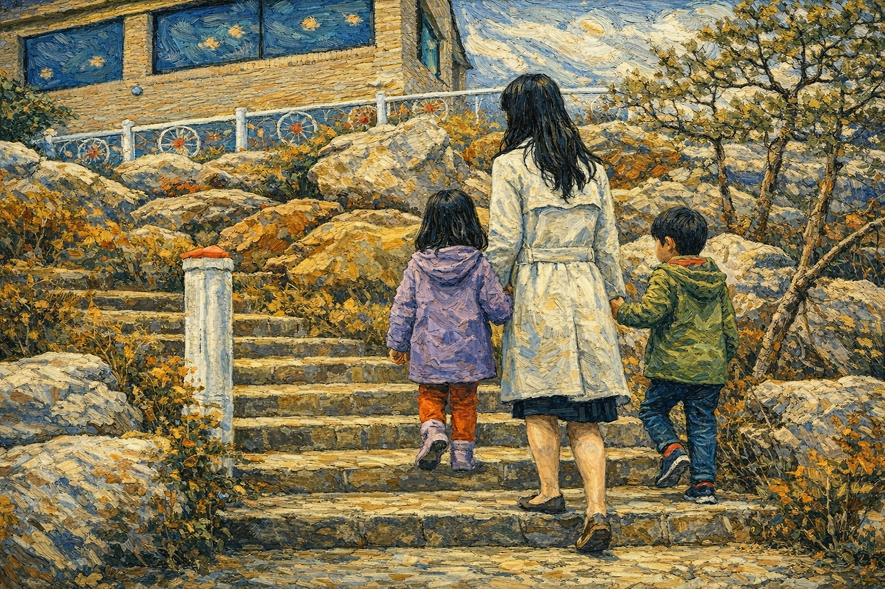 식사를 마치고 카페에서 빵과 커피를 나누며 따뜻한 한때를 보낸 뒤, 어느덧 헤어져야 할 시간이 왔다. 카페 문을 나서는데, 첫째 서윤이와 둘째 도윤이가 이수의 손을 꽉 붙잡았다.