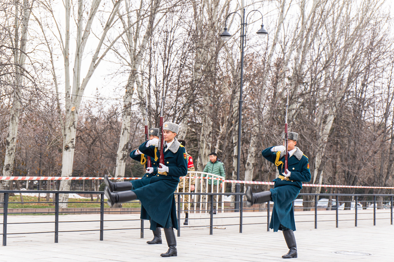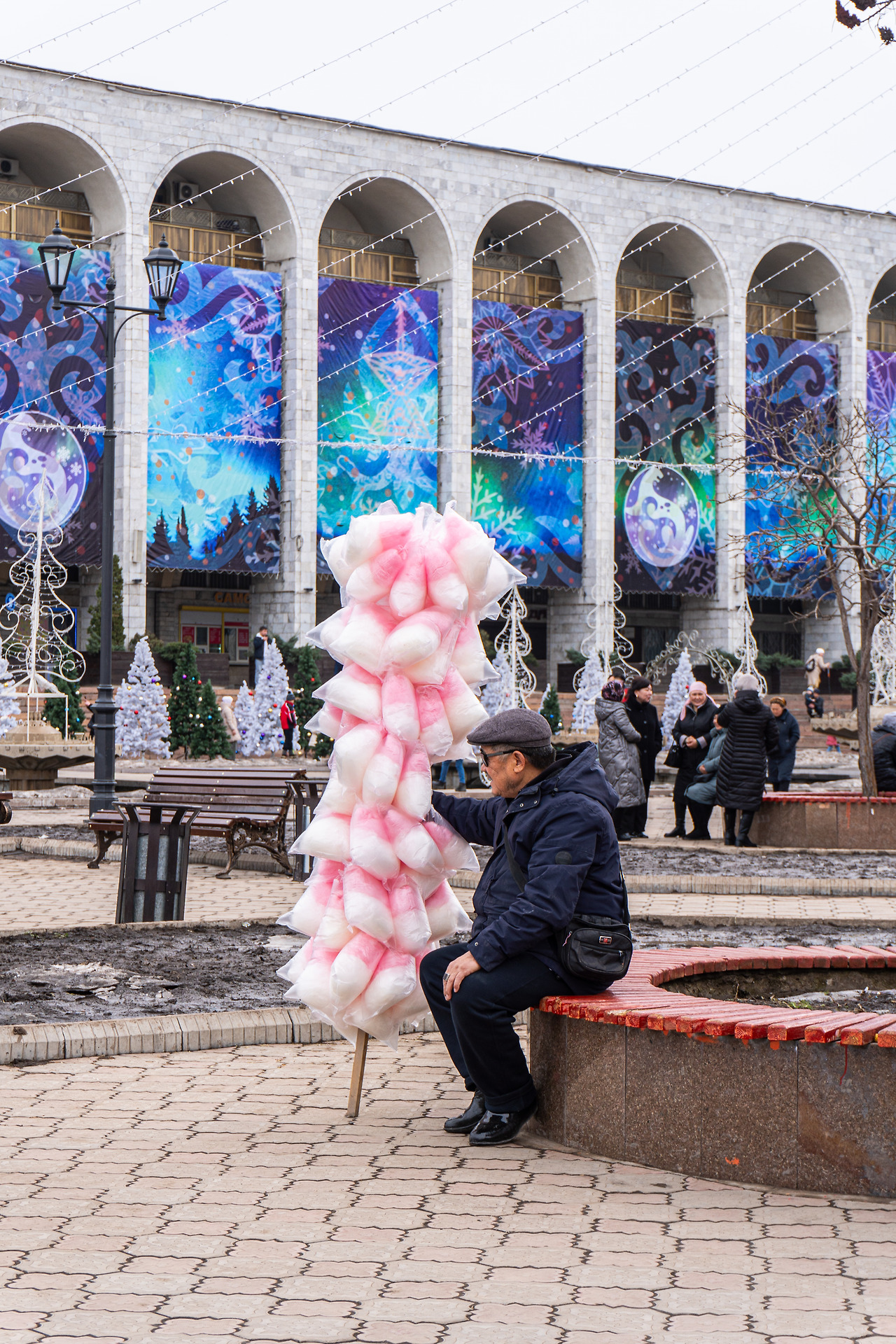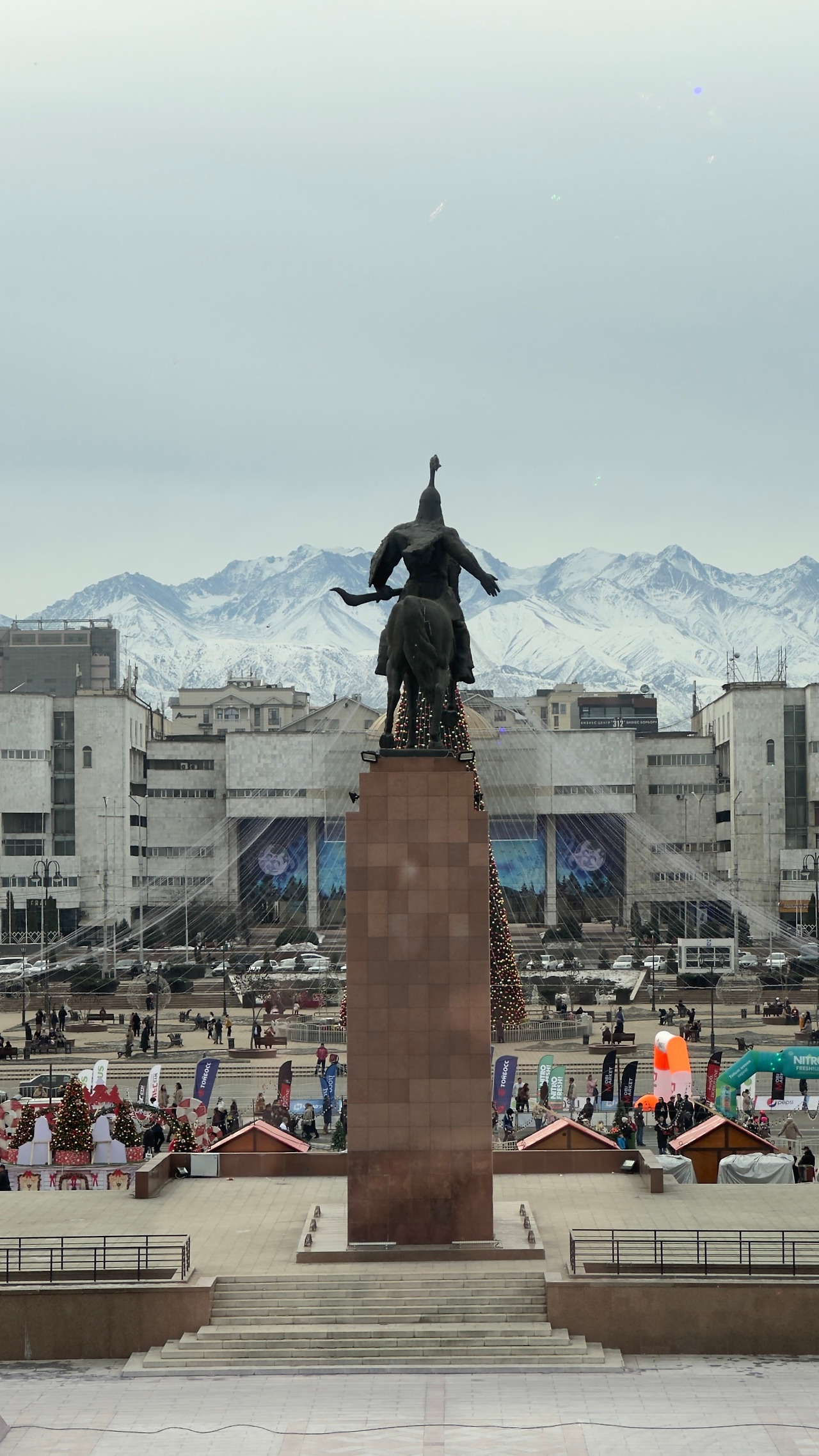 타협의 첫날은 여행보단 주말 어느 하루 같았다. 상우가 보내줬던 영상 첫 씬, 대형 트리가 들어 선 알라토 광장(Ala-too Square)은 구면이라 그나마 반가웠다. 광장을 중심으로 대통령궁과 시청, 국회의사당, 국립 역사박물관이 모여 있었다. 광장 한가운데 말을 탄 건국 영웅 마나스 장군 동상은 관광객이 목부터 허리까지 다 젖혀야 한눈에 들어올 만큼 높게 세워져 있었다. 그 옆으론 붉은 키르기스스탄 국기가 위엄 있게 펄럭였고, 맞은편 나지막한 건물들 너머 눈 덮인 산맥이 병풍처럼 서있었다. 흐린 중천에 걸린 태양의 역광까지. 이 나라의 장엄한 미장센같았다. 하지만 감격적이진 않았다. 그냥 세종대로사거리에 서 있는 느낌. 광화문광장의 세종대왕 너머 보이는 청와대와 북악산 일렬 뷰, 딱 그 시점이었다.