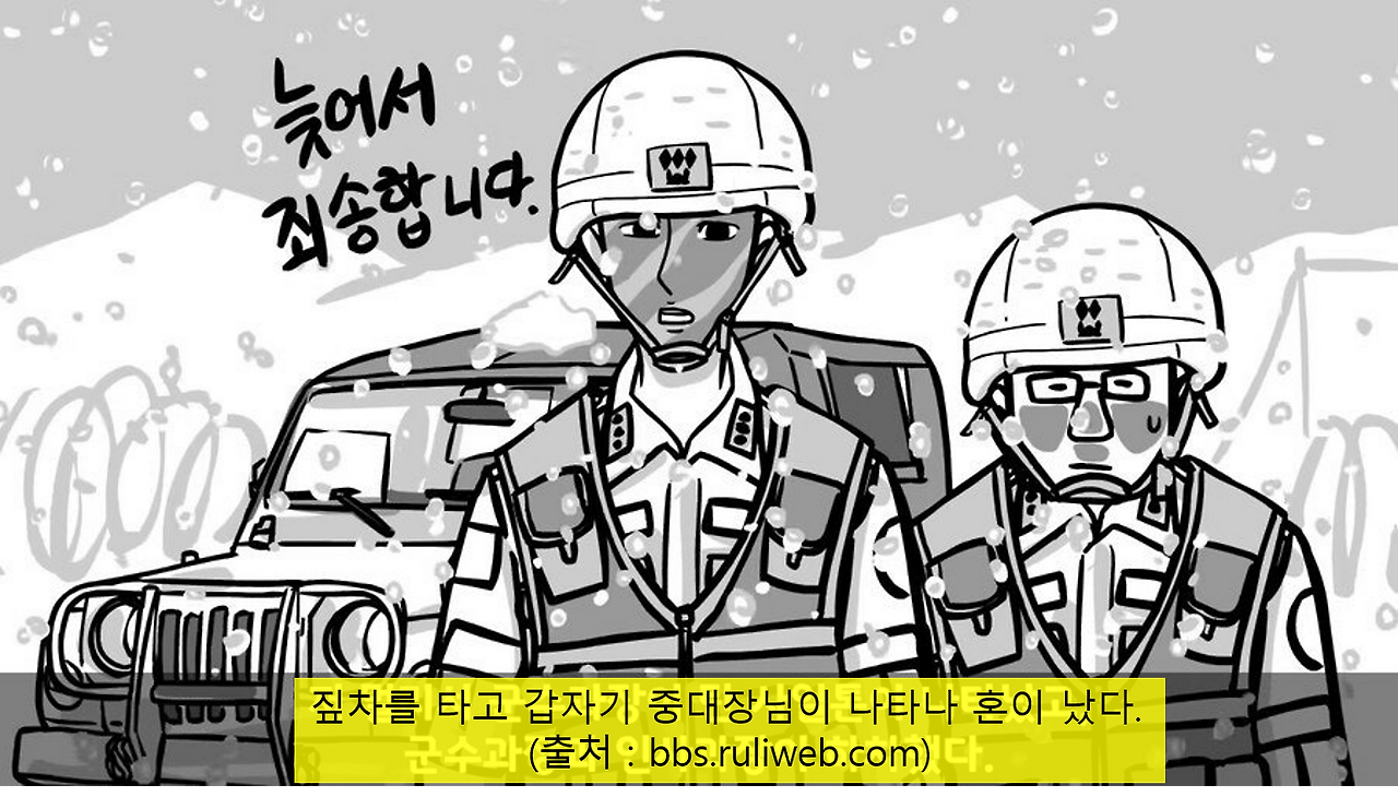 호랑이 중대장이 온갖 욕설과 조인트가 날아온다.