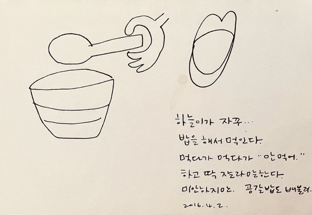 나는 자고 있는 아이들 모습을 어둠 속에서 연필로 슥슥 그리기를 좋아했다. 지금 그 그림들을 보면 동물인지 사람인지 모르겠어서 웃기지만 그때 내가 가졌던 감정, 고맙고 소중하고 애틋한 그 감정이 그대로 느껴져서 좋다.