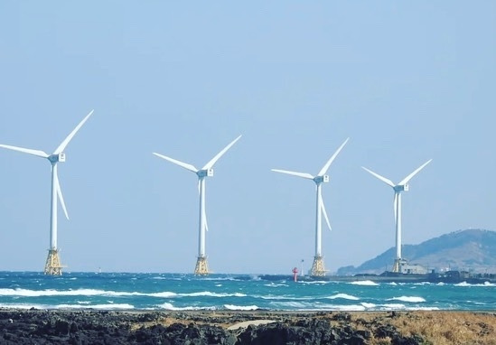 "제주도는 바람이 많이 불어서 풍력 자원이 풍부하구나! 가까이서 보니 정말 멋있다! 제주도의 상징이야!"