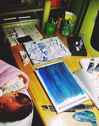 그림을 그리고 있는데 하늘이가 잠에서 깨는 바람에