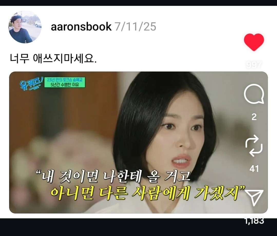 송혜교씨가 유퀴즈에 나와 한 말이 인상 깊어 내 생각을 짧게 적었다.