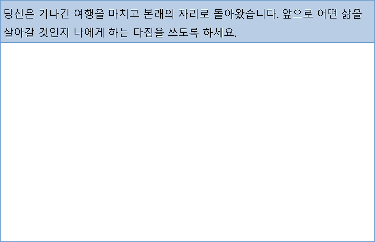 구름이 맑게 개고, 창가에 햇살이 쏟아지던 어느 날. 당신은 방으로 솔솔 들어오는 시원한 바람을 느끼며 하늘을 올려다보았어요. 광활하고 파랗기 까지 한 하늘은 상쾌함을 가져다주었죠. 당신은 미소를 띠며 펜을 들었어요. 꿈만 같았던 기나긴 여행을 마치고 새로운 삶이 시작되는 이곳. 당신은 앞으로 어떤 삶을 살아가겠노라며 공책에 글을 적기 시작했어요. 그것은 나에게 하는 말이었고, 나에게 전하는 마지막 다짐이었죠.