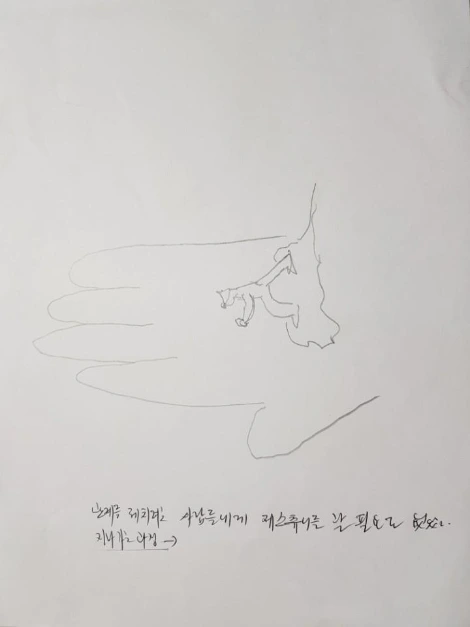 청년은 그림과 같이 나는 누군가의 손바닥 위에 놓여 자유롭지 못하다고 했다. 이 알 수 없는 존재가 내 삶을 좌지우지한다고 말했다. 그래서 아무리 노력을 해도 결국은 부정적인 상황으로 갈 거라는 생각으로 가득 차 있었다.