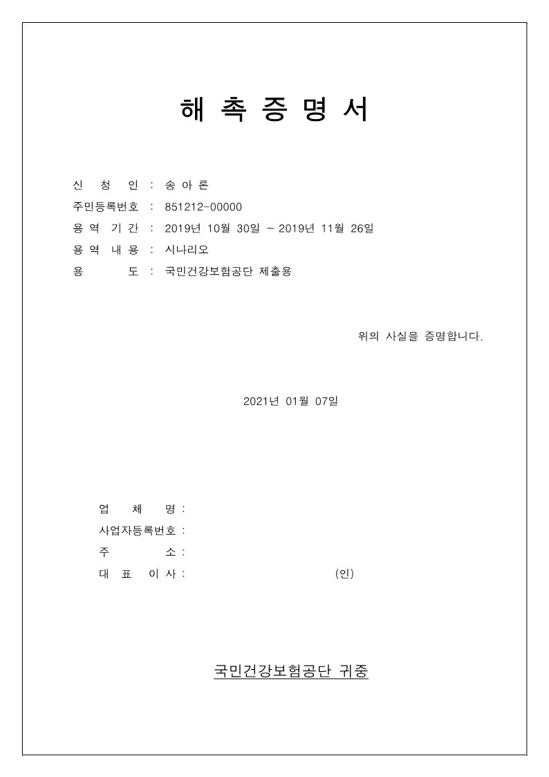 해촉 증명서는 내가 언제부터 언제까지 일을 했다는 증명서이다. 해촉 증명서를 건강보험공단에 제출하면 보험료 조정을 받을 수 있다. 업체가 문서를 만드는 건 귀찮아하니, 미리 만든 문서를 만들어 주도록 하자.