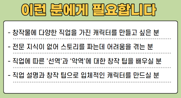 이 책에 나와 있는 다양한 직업 설명을 읽어보고 설정하면 된다. 과학자가 주인공이 되어 기존 과학수사와는 다른 기법으로 프로파일러를 잡을 수도 있고, 건축가만이 볼 수 있는 설계 노하우를 통해 프로파일러를 잡을 수도 있다. 여기서 핵심은 주인공의 ‘자기 전문 분야’를 응용해 추리해야 한다는 것이다. 예를 들어 주인공이 과학자인데, 과학에 대한 추리가 하나도 없다면 굳이 과학자를 할 필요가 없다는 것이다.