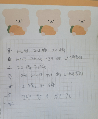다음날 첫째 방에서 책상의 메모를 발견했다. 중학교 1학년 2학기를 보내고 있는 첫째는 아직까지 학원 없이 공부 중이다. 어려서는 나의 가치관으로 학습지를 시키지도 않았고 교과 학원도 보내지 않았는데, 아이가 크면서 원하면 보낼 생각이었다. 중학교 입학을 앞둔 초6 겨울방학에 '엄마, 수학 학원을 이제 다녀야 할까?'라고 물었다. 주변 친구들이 기존 영, 수에 추가로 국어, 과학도 다님을 알고는 있으니 딸도 어렴풋이 중학교에 대한 부담은 있었으리라. 그러나 친한 친구가 쉬는 시간까지 수학학원 숙제를 풀고 있던 모습을 떠올리며 과한 숙제는 싫다는 생각, 학원 버스 타고 왔다 갔다 하는 것도 힘들 것 같다는 이유, 친구의 영어 학원 초청 행사에 다녀오면서 밤늦게 끝나 피곤할 것 같다는 이유가 섞여 EBS 인강으로 해보겠다며, 수학 개념서 1-1을 사달라고 요청했다.
