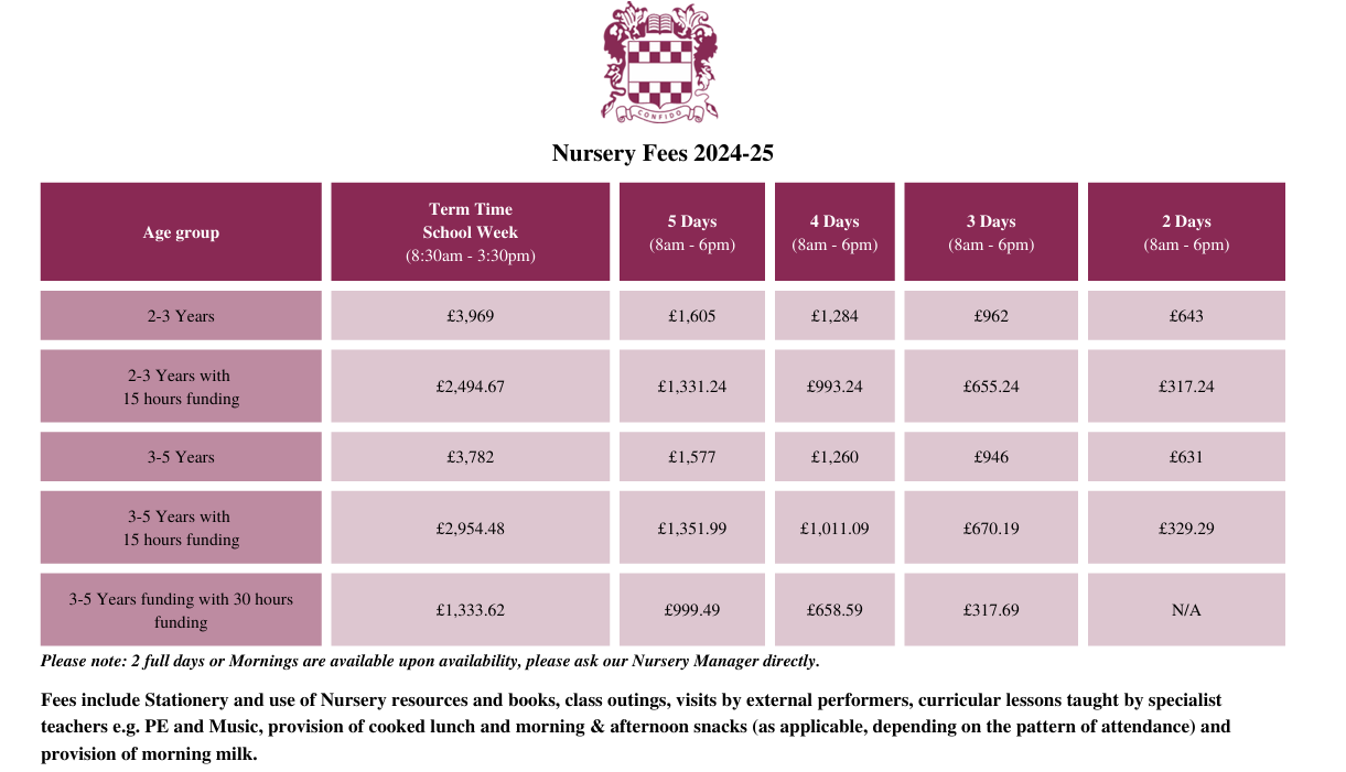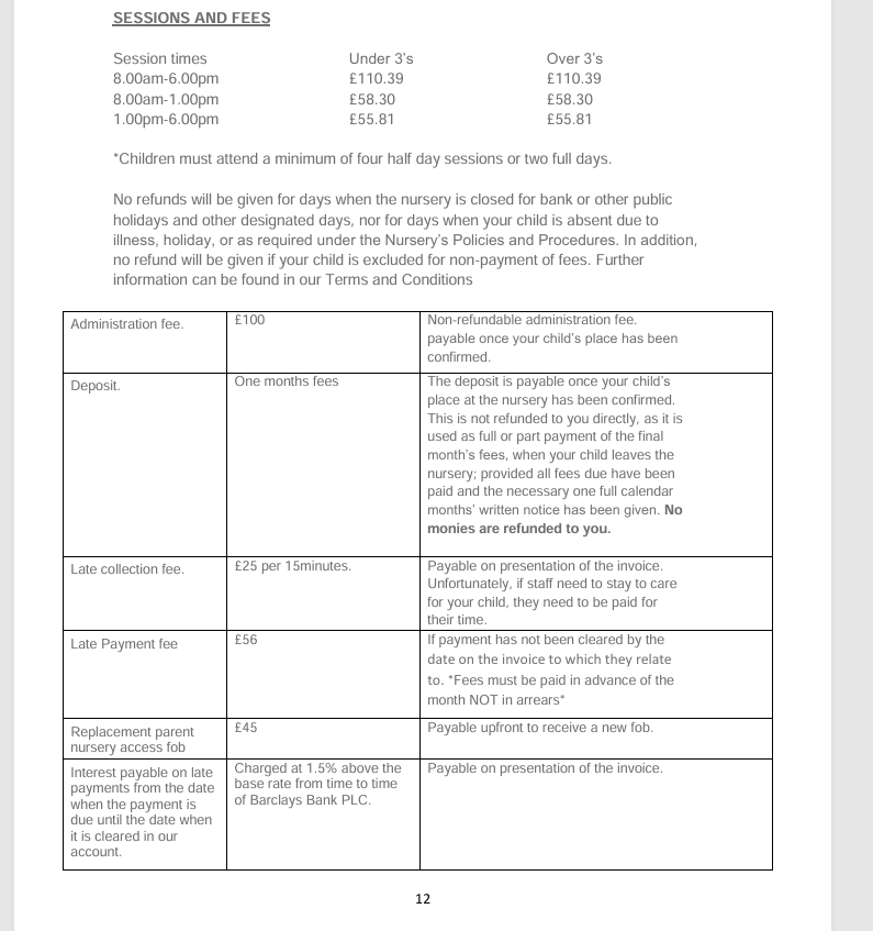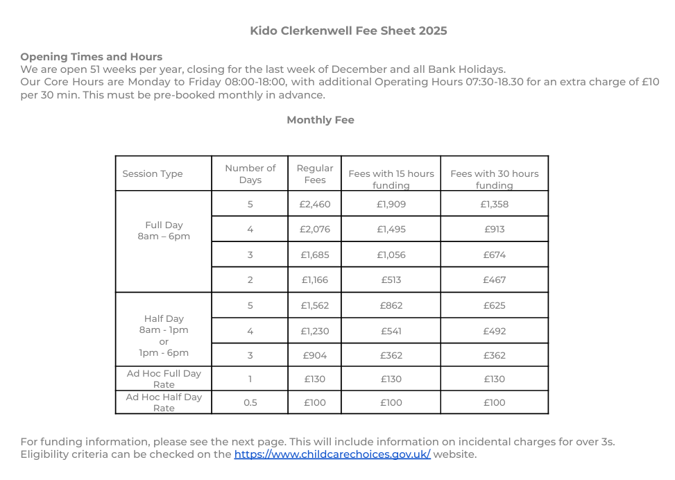 - 보육비용 : 8시-18시 기준 일당 £110 / 반일반 가능 / Termtime only funding 가능 / 등록비 £100 별도