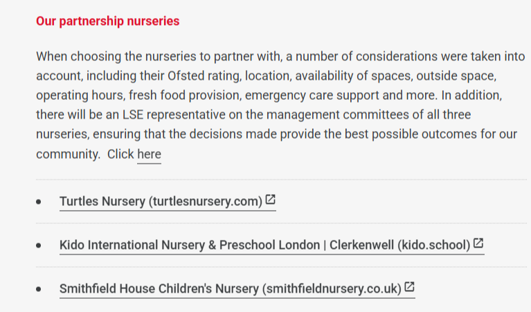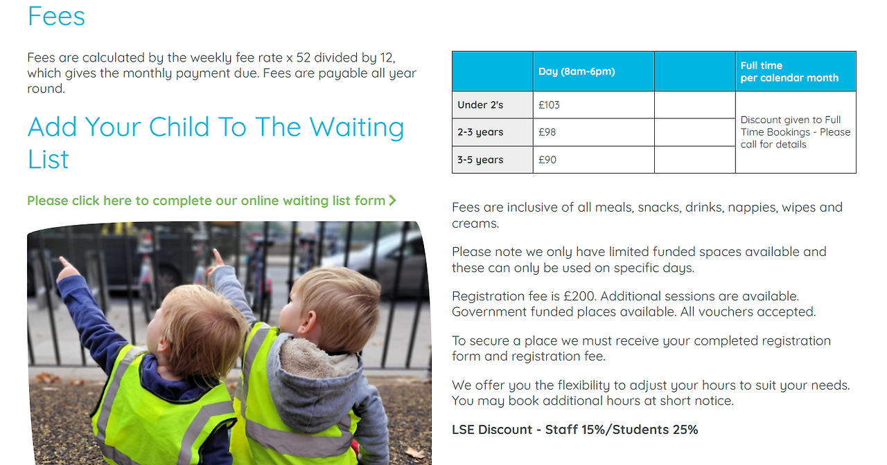 그 와중에 반가운 소식은 내가 다니게 될 LSE에서 학생 복지 차원에서 제휴된 3곳의 Nursery에 대해서는 보육비용의 25%를 지원해 준다는 것이다. 비용적으로도 매력적이지만 세 곳 모두 학교와 매우 가까운 위치이며, 영국정부가 부여하는 Ofsted 등급도 모두 우수하다는 점에서 자연스럽게 나의 최우선 고려사항이 되었다.