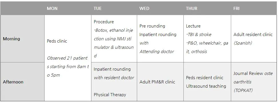실제로는 정해진 스케줄이 따로 없었다. 나를 받아준 교수님은 월화 외에는 다른 병원에 있는 환자를 보러 가기 때문에 교수님이 부재한 날은 열심히 돌아다니며 많은 것들을 경험하려고 노력했다.