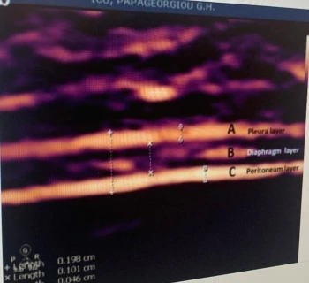다음으로 교수님이 초음파로 Diaphragm을 보는 모습을 보았다. 오른쪽에서는 간을, 왼쪽에서는 신장을 찾으며 가이드로 찾아가는데 처음으로 초음파로 diaphragm을 봐서 신기할 따름이었다. 궁금해하니 교수님이 아래와 같은 강의록을 보여주며 조금 더 설명해주셨다.