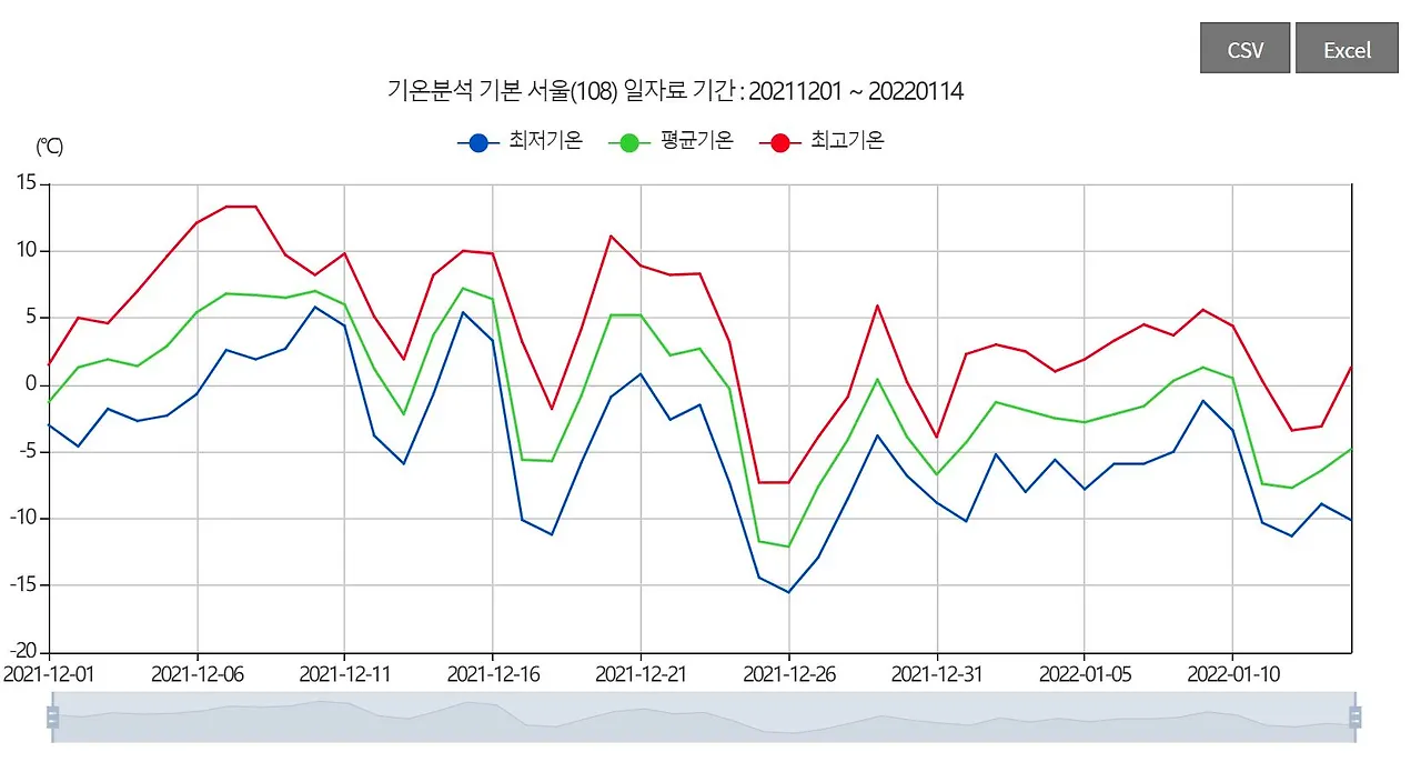 같은 기간을 비교하기 위해 2020/12/01 ~ 2021/01/14까지 45일의 기온과 2021/12/01 ~ 2022/01/14까지 45일의 기온을 비교했는데 데이터를 보니 작년 겨울이 더 추웠다.
