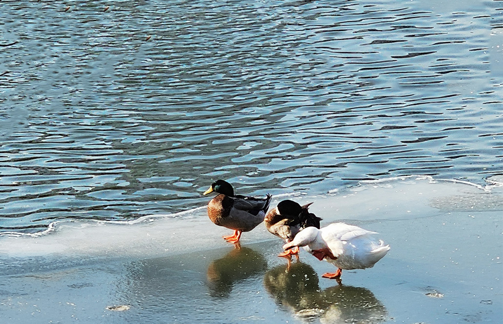 살짝 얼은 호수 위에 앉아 있는 청둥오리 한쌍과 오리 한 마리가 위태로운 그들의 모습을 떠올리게 했다.