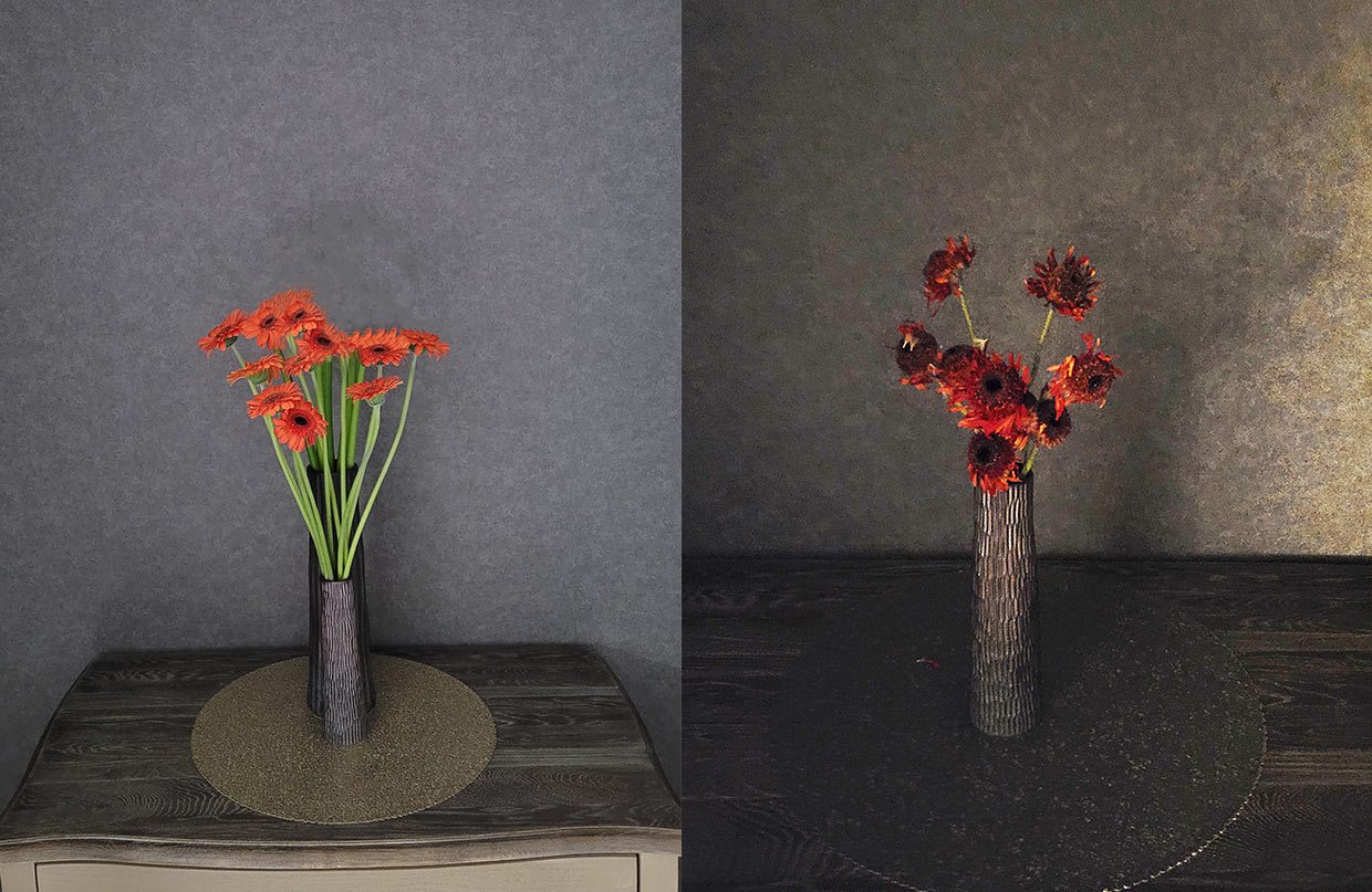 매일 아침에 꽃 손질을 하느라 나의 고요한 새벽이 분주했지만 우아하고 화사한 꽃이 집을 환하게 밝혀주어 좋았다. 매일매일 정성껏 손질해 주고 물도 갈아줬더니 거베라는 일주일 넘게 우리 집을 화사하게 비쳐주었다. 열흘쯤 되었을까, 시든 꽃들을 버리려고 하다가 문득 꽃을 말리면 고흐의 해바라기 같은 분위기가 날 것 같다는 생각이 들었다. 물에 젖은 가지를 잘라주고 줄기가 서로 닿지 않게 한 송이씩 거꾸로 매달아 주고 위치를 바꿔주며 정성껏 말렸더니 멋진 꽃이 탄생했다.
