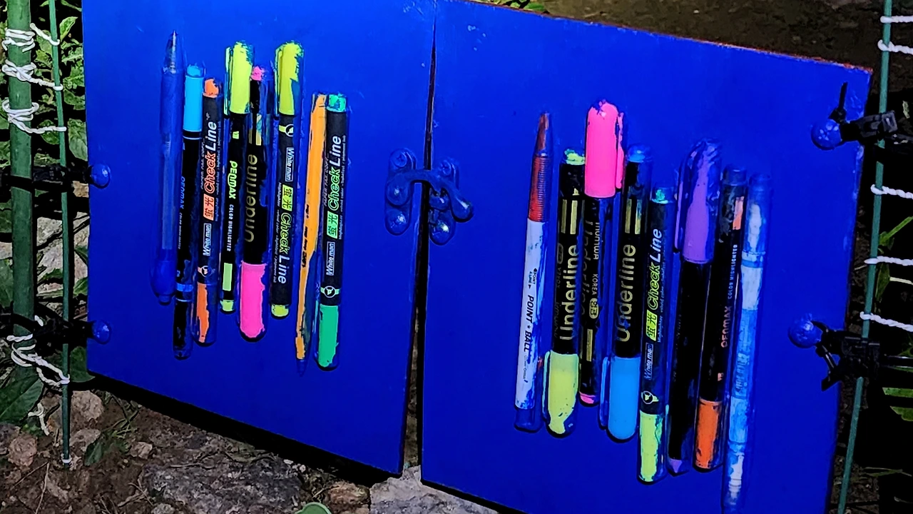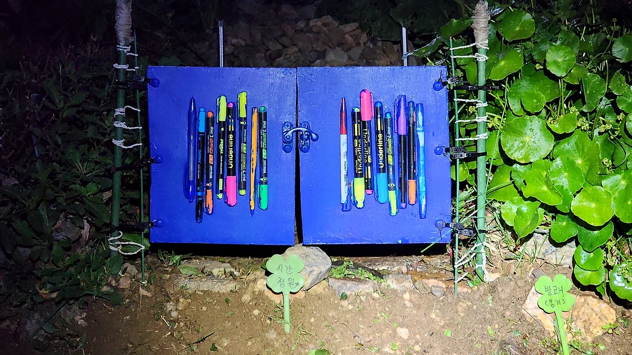 이번에는 블루다. 그냥 높은 가을 하늘에 맞춰서, 바다 빛깔이 좋아서 블루로 했다. 뒷면은 빨강이다. 장식은 다 쓴 형광펜들과 볼펜들로 했다. 버릴까 하다가 이번에는 장식으로 써야지! 하고 모아두었던 것들이다.