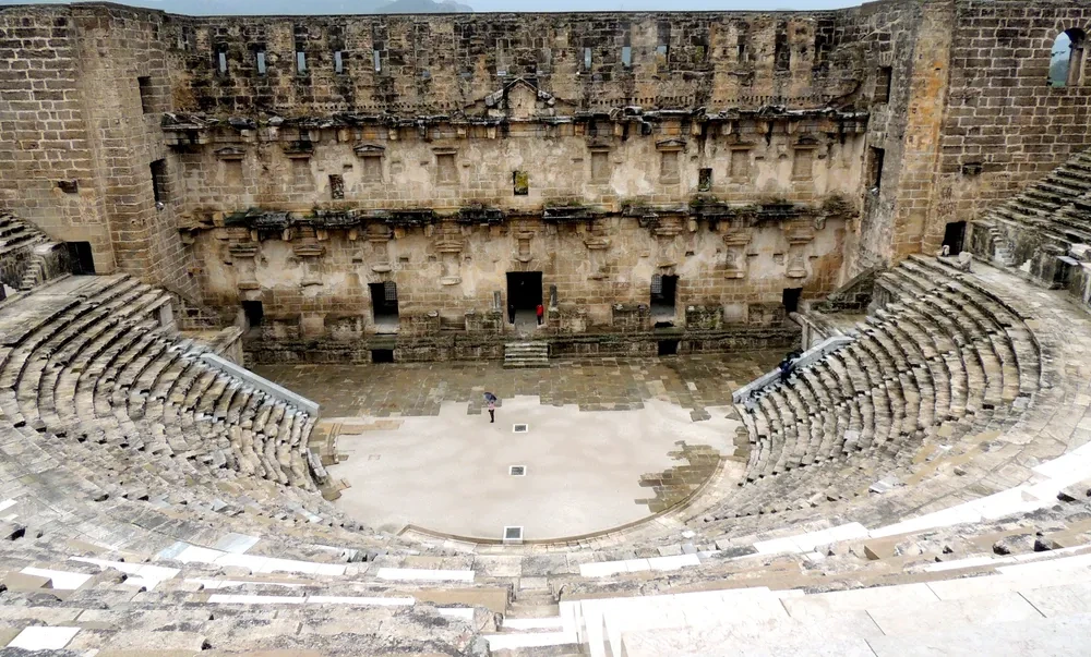 * 사진 설명/ 아스펜도스 극장은 튀르키예의 안탈리아 동쪽에 위치한 고대 로마 시대 극장으로 현재는 유명한 관광지이다. 이 극장은 AD 2세기에 로마 황제 마르쿠스 아우렐리우스를 위해 건설되었으며, 1만 5000명을 수용할 수 있는 돌계단을 갖춘 웅장한 건물이다.
