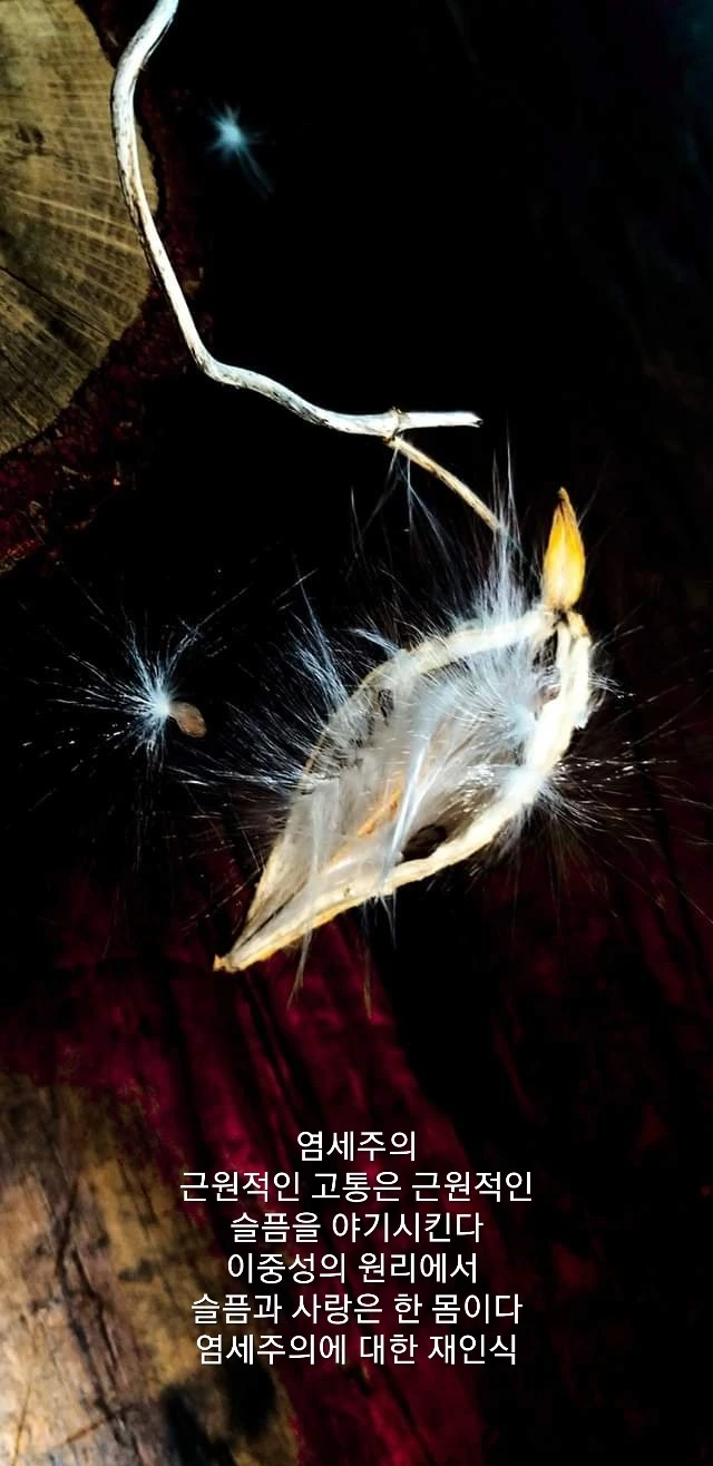 * 염세주의는 바로 이러한 관점에서의 염세주의인 것이다. 근원적 고통은 근원적인 슬픔을 야기시킨다. 어쩌면 우리의 근원적인 그리움은 "하나"에 대한 것일 것이다. 가슴이 텅빈 듯한 그런 느낌에서 오는 그 그리움은 또한 충일감으로 회복된다. 이러한 작용이 죽음과 부활에 대한 감각일 것이다. 그리고 이것을 둘러싸고 있는 막인 커다란 슬픔은 그 자체로 '정서'를 만들어 내는 것이며, 이 슬픔에도 이중성의 원리는 작용되어 커다란 슬픔은 곧 사람의 감정임을 일깨우는 것이라고 보인다.