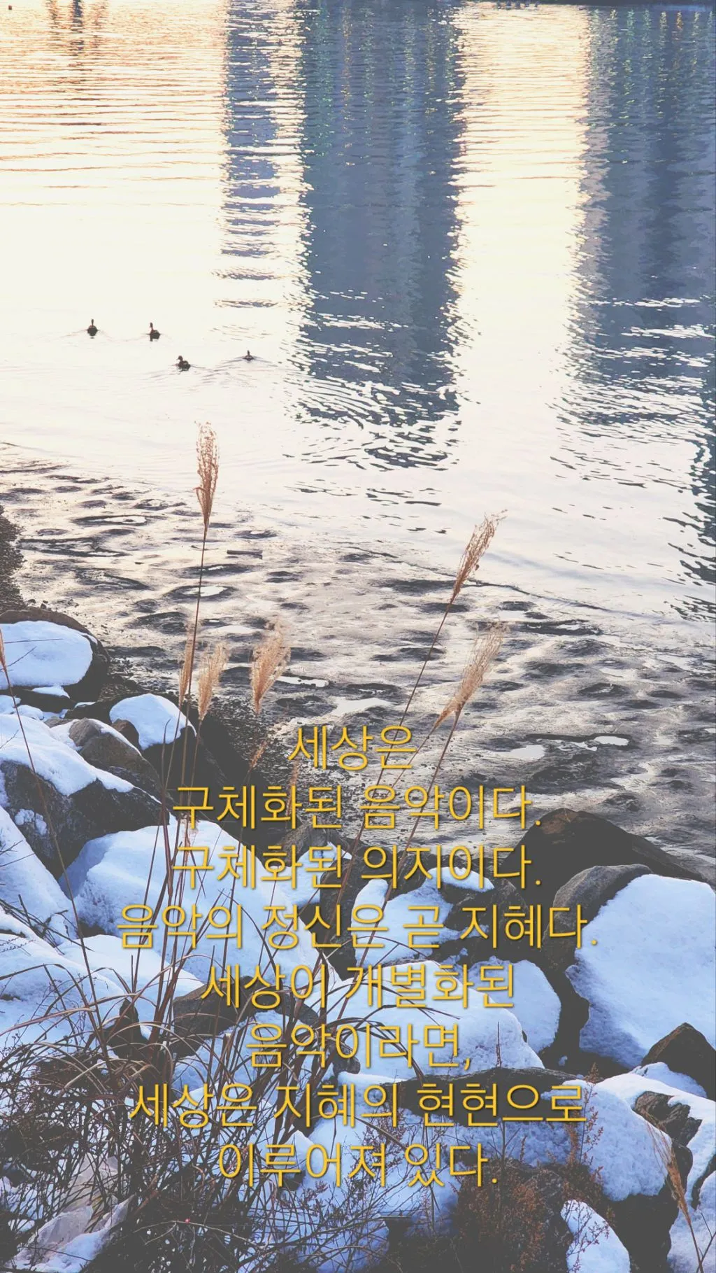 우리가 사는 세상이 음악의 현현이라는 것에서 보자면, 우리는 세상을 좀 더 친근한 눈으로 바라보아도 좋을 것이다. “나”와 아주 친한 관계인 것이다. 그것을 회복한다면, 분명 삶의 눈높이와 만족도 역시 달라질 것이다. 세상은 나를 필요로 하고 나는 세상을 필요로 한다. 이 둘은 불가분의 공생관계다. 음악이 세상에 품위를 부여하고, 음악이 세상을 더 높인다. 그것이 아름다움일 것이다. 음악은 곧 지혜다. 세상이 구체화된 음악이라면, 세상에 존재하는 물 자체는 “지혜”의 또 다른 현현일 것이다.