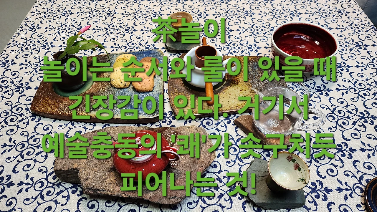 한 세트 형태도 아름답지만 여러 차도구를 그때에 알맞게 조합해 보는 일은 내밀한 즐거움을 준다. 이렇게 조합해 보는 것에서 차의 아름다움을 알아가고 차의 변화와 창작성도 같이 익히게 된다고 생각한다. 차도구를 선별하고 찻자리를 세팅하고, 이런 일련의 준비과정은 단순히 일이거나 노동만은 아니다. 그 과정에서 어떤 안에서부터 피어나는 그리움 같은 것이 꽃처럼 피어난다. 이렇게 준비되어지는 것이다. 그리고 찻자리에서 차를 우리고 차를 마시면, 그 한 잔의 차맛이 온몸에 퍼지면서 환희감을 준다. 또한 이렇게 영상이나 사진으로 기록해 놓으면, 이 느낌은 영상과 사진 작업을 하면서 계속 이어진다. 그 느낌에 의하여 분위기 잡혀 글을 쓰게 된다. 글은 충동처럼 솟구치며 피어나는 그것을 잡고서 이어진다. 니체는 이러한 것을 '예술충동'이라고 하였다.