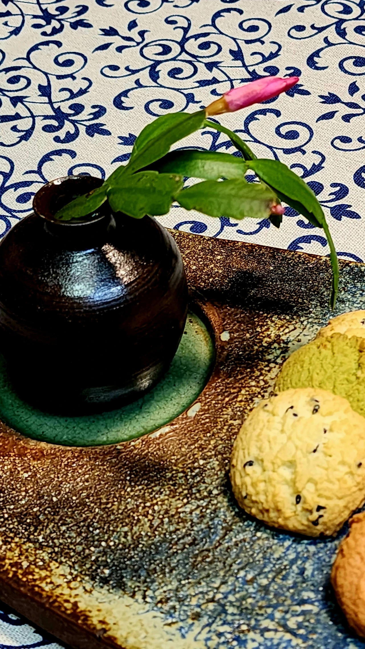 게발선인장이 샹들리에처럼 피어나서 다화로 사용하였다. 제주 흙으로 만든 옹기 화병과도 잘 어울렸다.