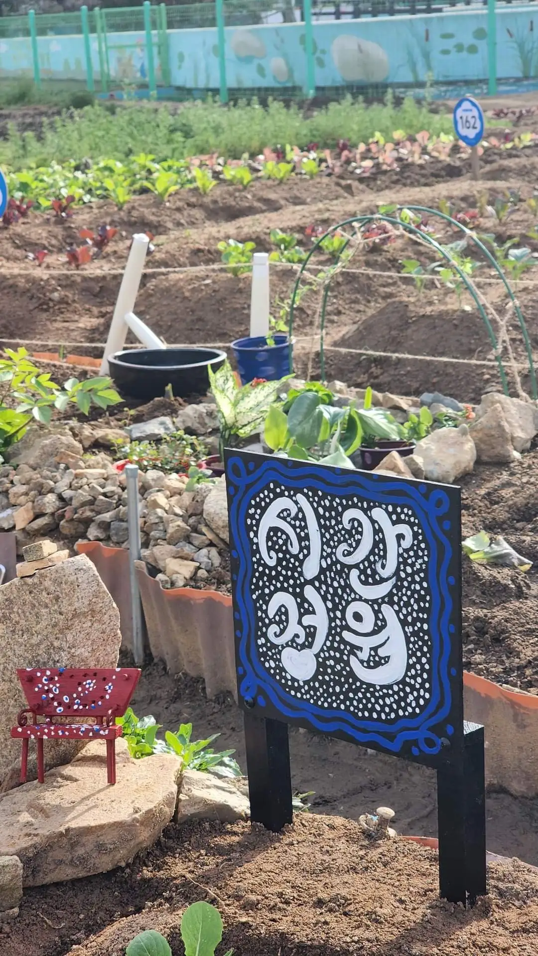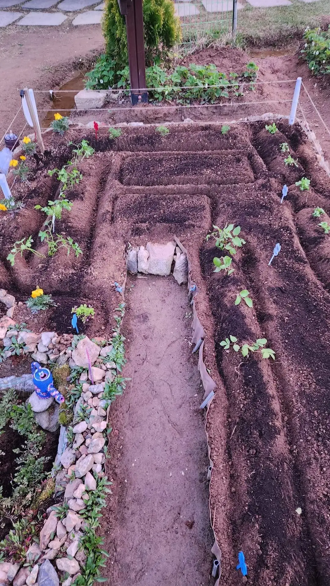 안 쓰는 의자를 분해하여 텃밭 가장자리에 세웠다. 그리고 마 끈으로 울타리를 쳤다. 그저 형식적이기는 하지만 텃밭의 형태를 잘 드러내 주고 무엇보다 강아지들이 울타리 너머로 잘 들어오지 않기에 효과적이었다.