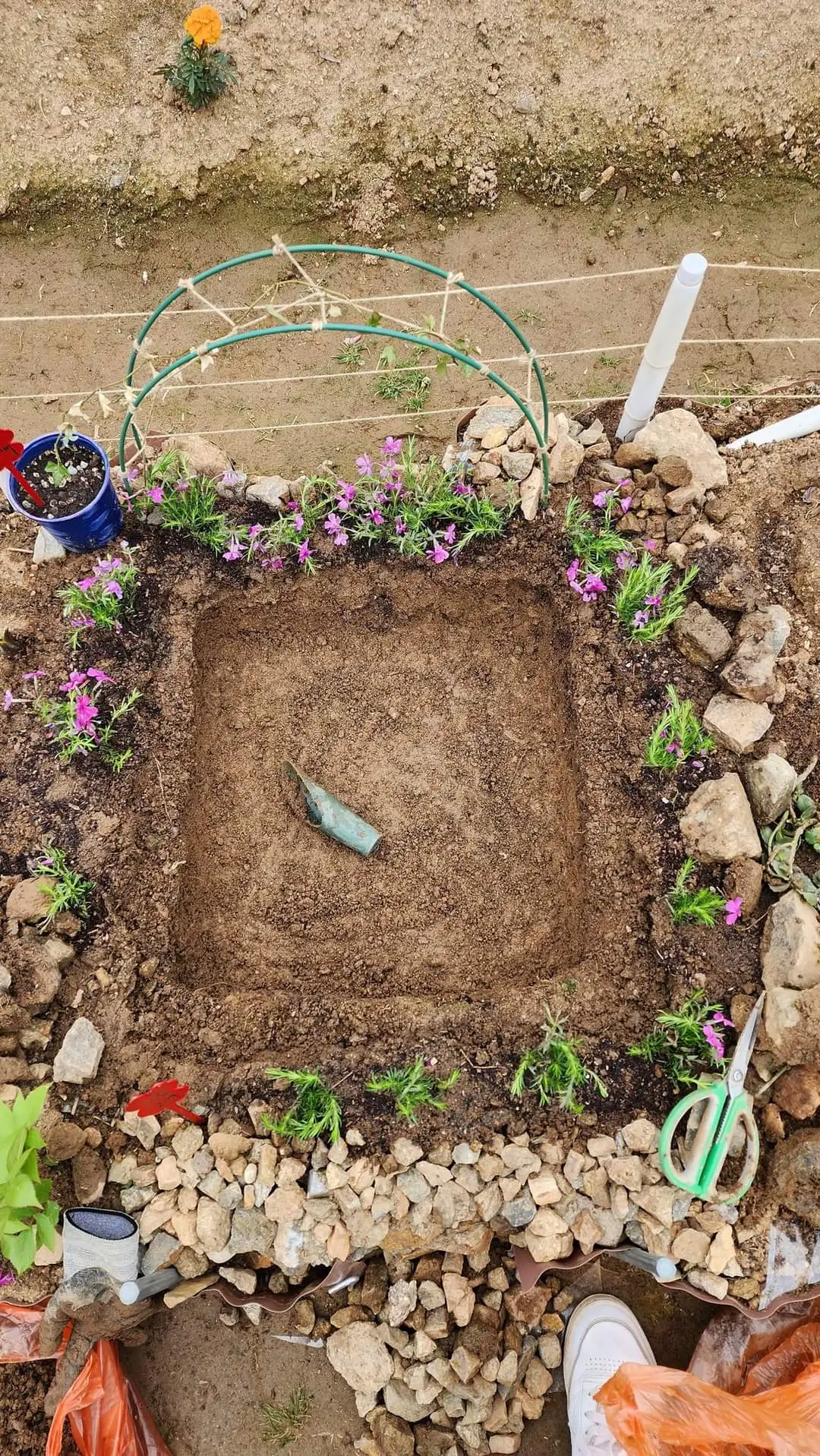 새로 만든 연못에 물이 너무 빨리 빠졌다. 다시 보수공사를 했다. 폭을 넓혔더니 준비해 온 비닐이 맞지 않았다. 집에 다녀오려니 벌려 놓은 풍경이 마뜩지 않아서 관리실에서 비닐 하나를 얻었다. 그래도 크기가 맞지 않아서 비닐봉지 옆과 밑을 터서 넓게 만들었다. 반은 접여서 두 겹인데 한쪽은 한 겹이어서 또 아슬아슬 해졌다. 아마도 어느 틈에 찢겨 또 물이 샐 것이다. 그래도 이번엔 돌만 걷어 내면 보수공사가 쉽도록 해놔서 별 무리는 없을 듯하다. 다음엔 비닐을 넉넉히 준비해야지 싶었다.